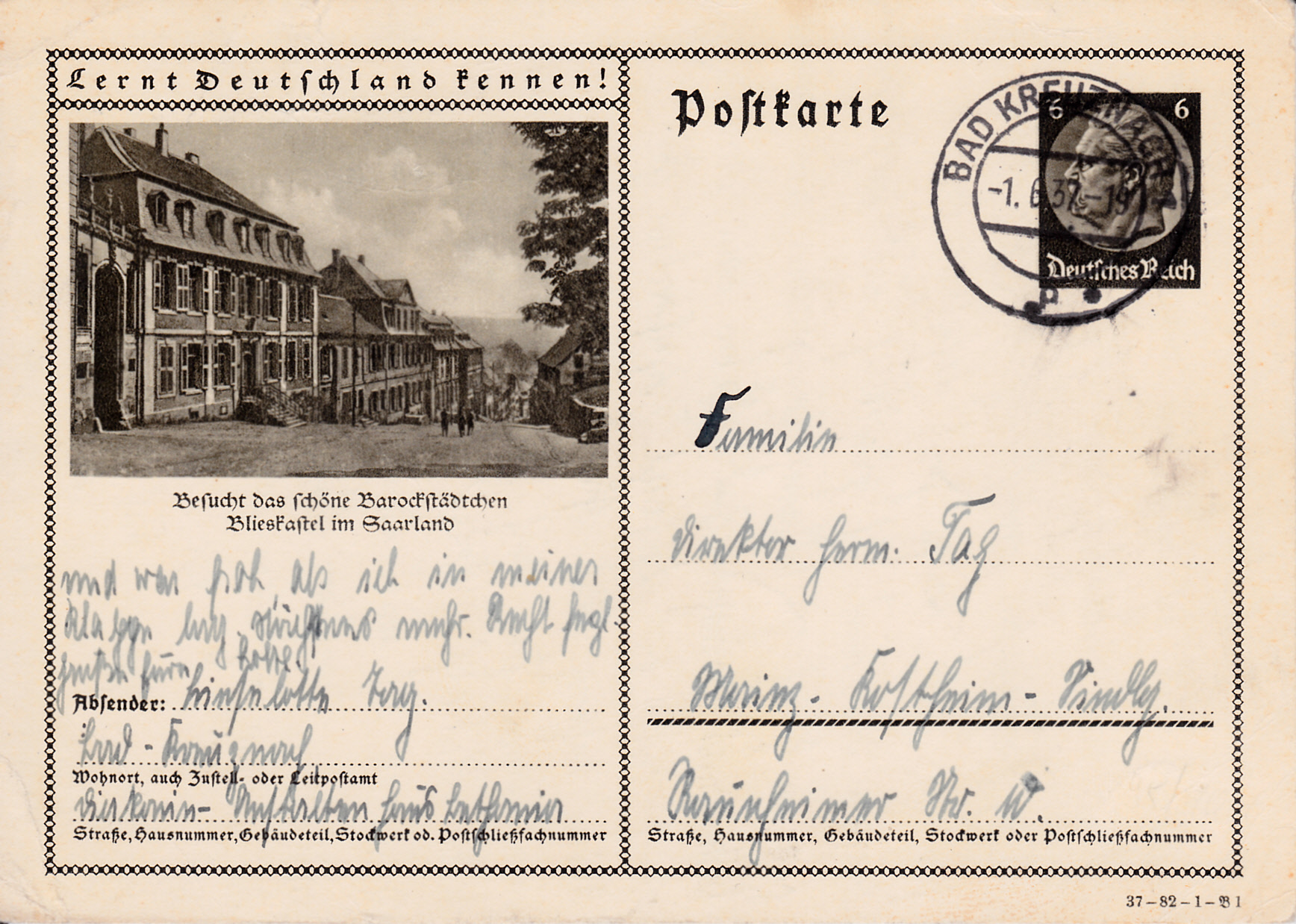 Auf dem Foto dieser Karte (Serie 82 Bild 1) ist ein Straßenzug aus Blieskastel im Saarland zu sehen.