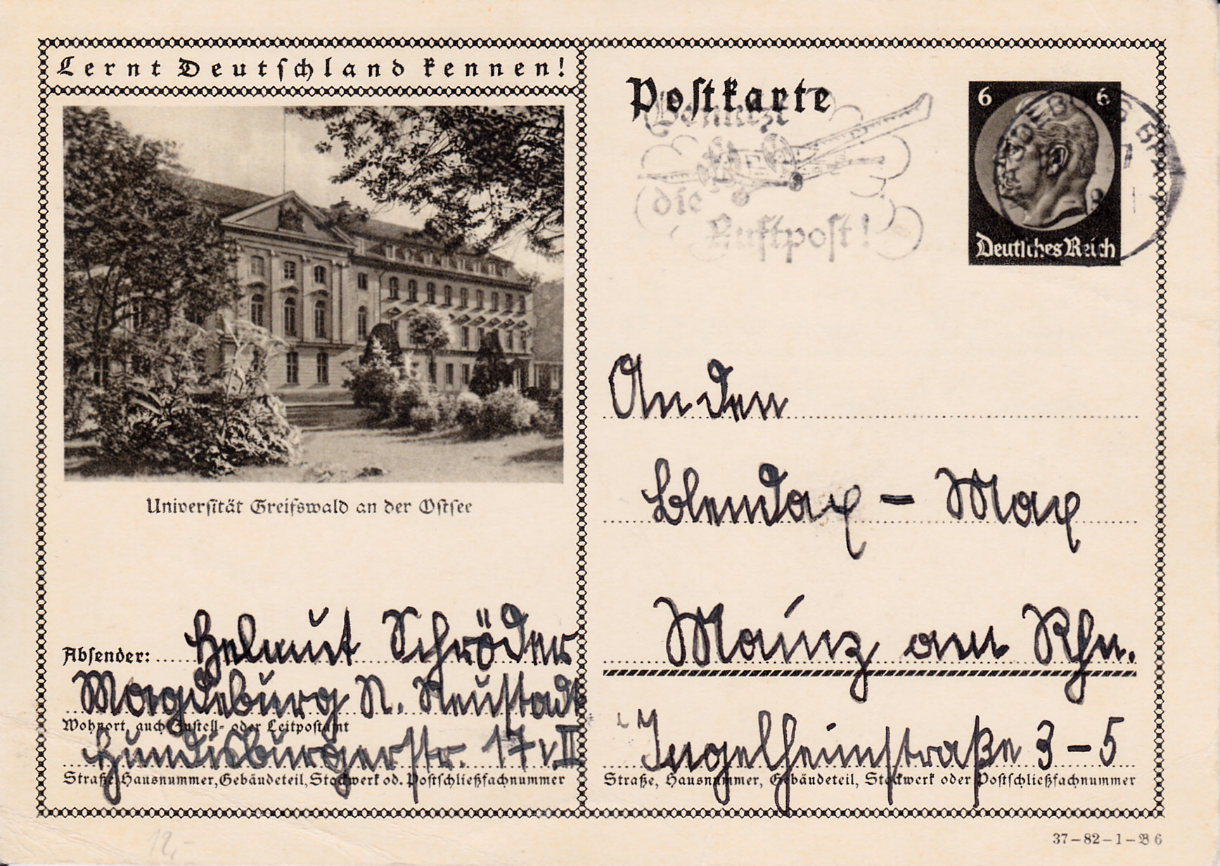 Das Universitätsgebäude in Greifswald wird 1937 mit einem weiteren Foto auf dieser Karte (Serie 82 Bild 6) gezeigt.