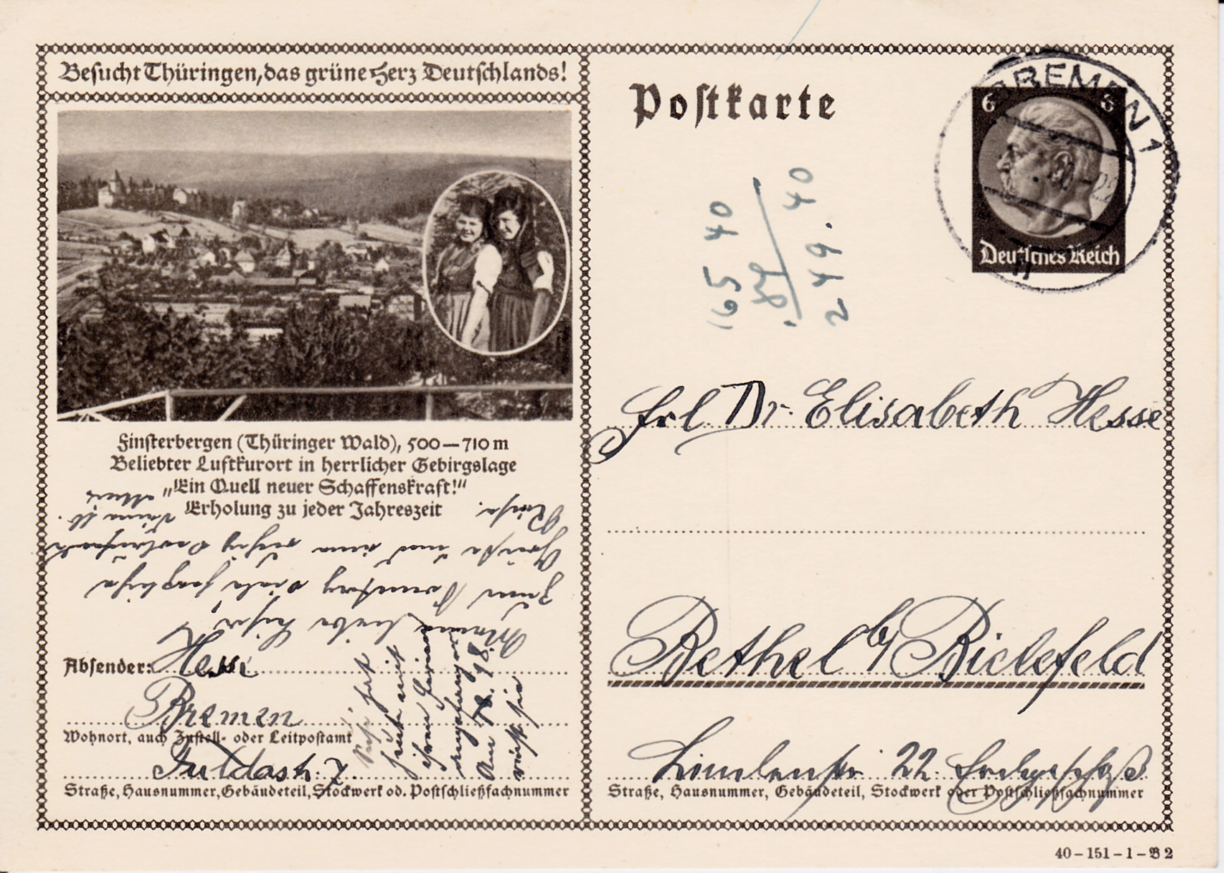 Finsterbergen im Thüringer ist auch 1940 wieder mit einer Karte (Serie 151 Bild 3) vertreten und zeigt eine weitere Ansicht des Ortes und im Oval wieder ein Trachtenbild.