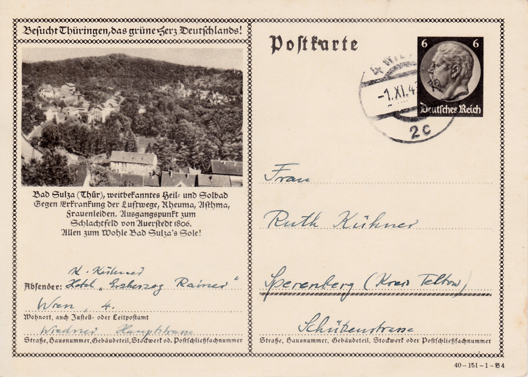 Auf dieser Bildpostkarte (Serie 151 Bild 5) weist Elgersburg (Thüringen) auch 1940 wieder mit einem ähnlichen Bild auf sein Jubiläum "110 Jahre Luftkurort" hin.