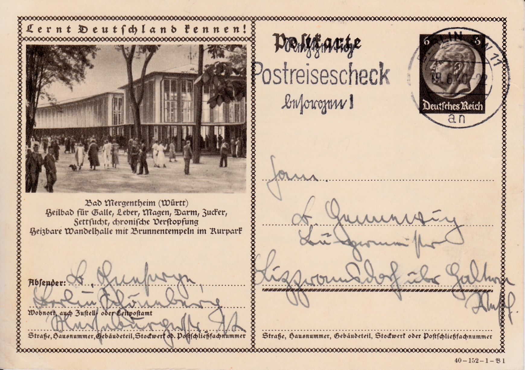 Auch Bad Mergentheim zeigt 1940 erneut auf einer Karte (Serie 152 Bild 1) die Wandelhalle in Bad Mergentheim.
