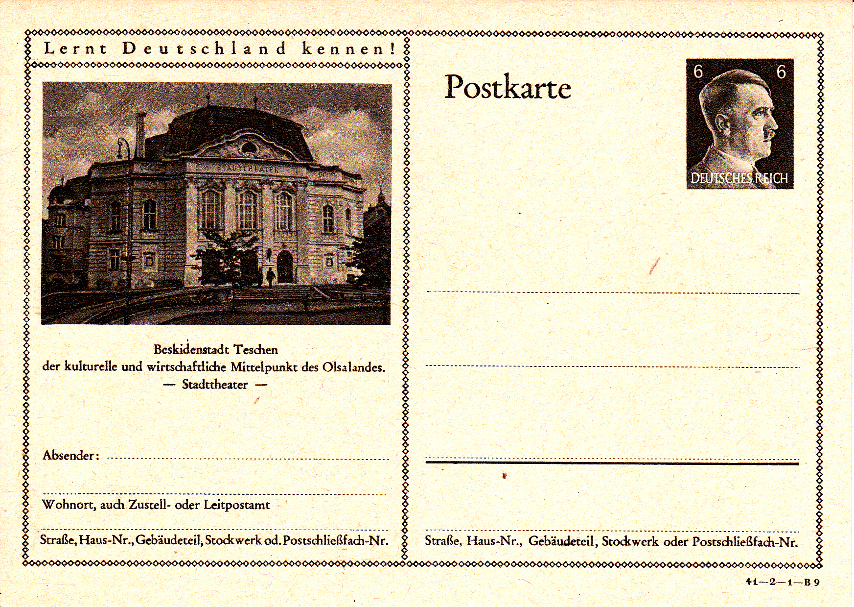 Teschen zeigt auf dieser Karte (Serie 2 Bild 7) sein Stadttheater (heute: Adam-Mickiewicz-Theater). Teschen heißt heute Cieszyn und ist der im Süden Polens gelegene Teil der polnisch-tschechischen Doppelstadt Cieszyn / Český Těšín in der Woiwodschaft Schlesien.