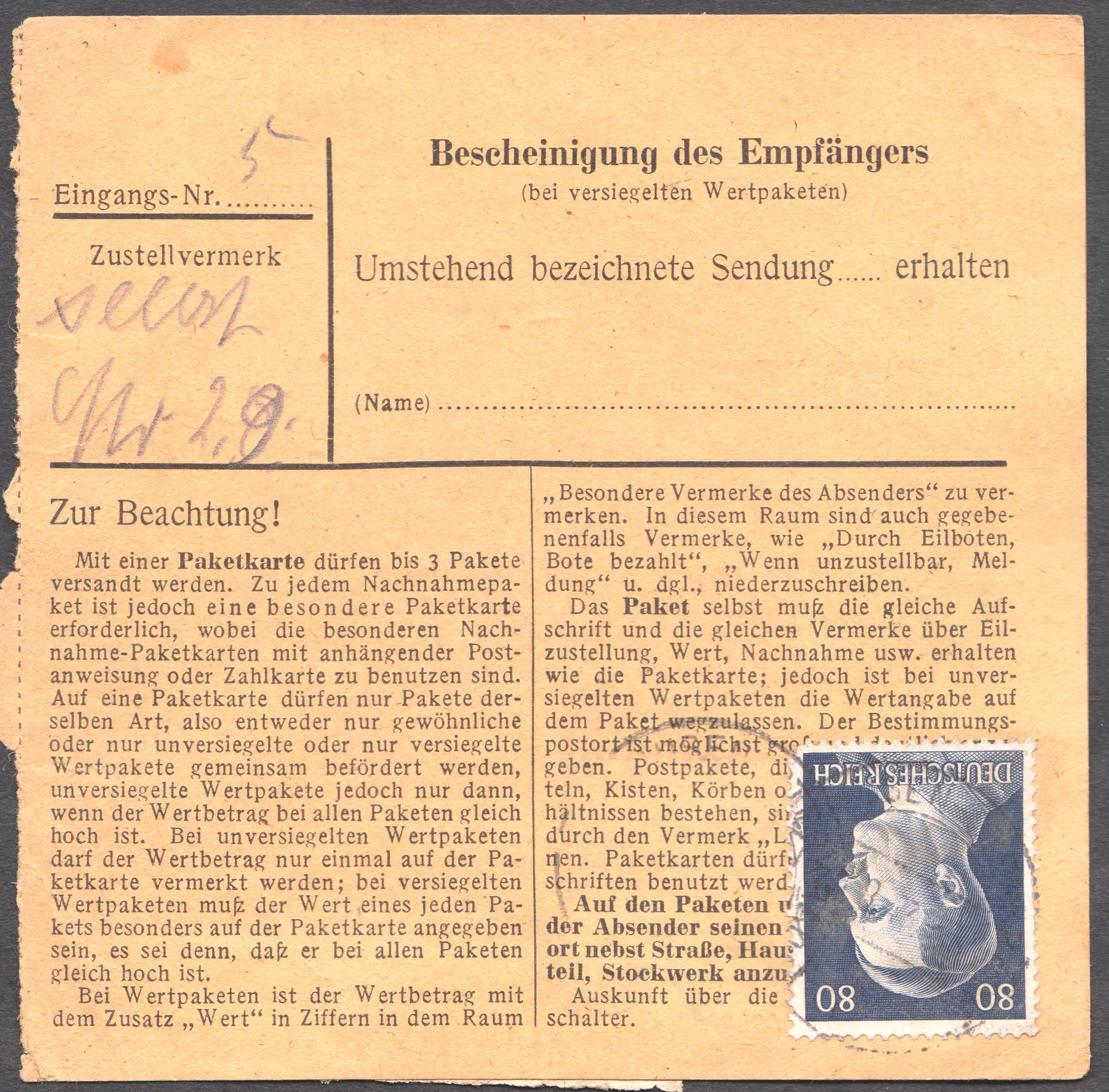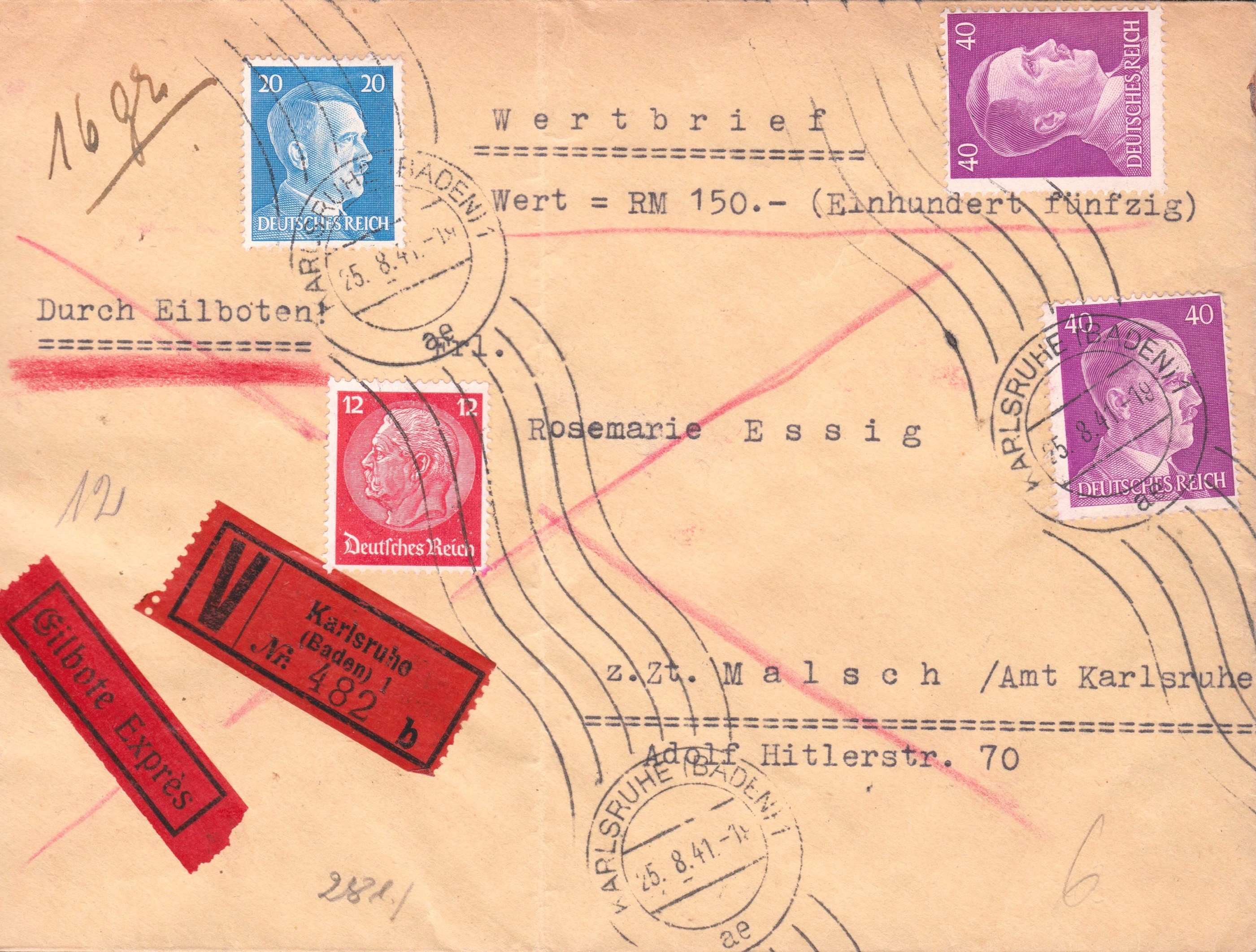 Wertbrief "Durch Eilboten", aufgegeben am 25.08.1941 in KARLSRUHE (BADEN) 1, gelaufen nach MALSCH (KR KARLSRUHE), wo er am 26.08.1941 um 5 Uhr ankam: