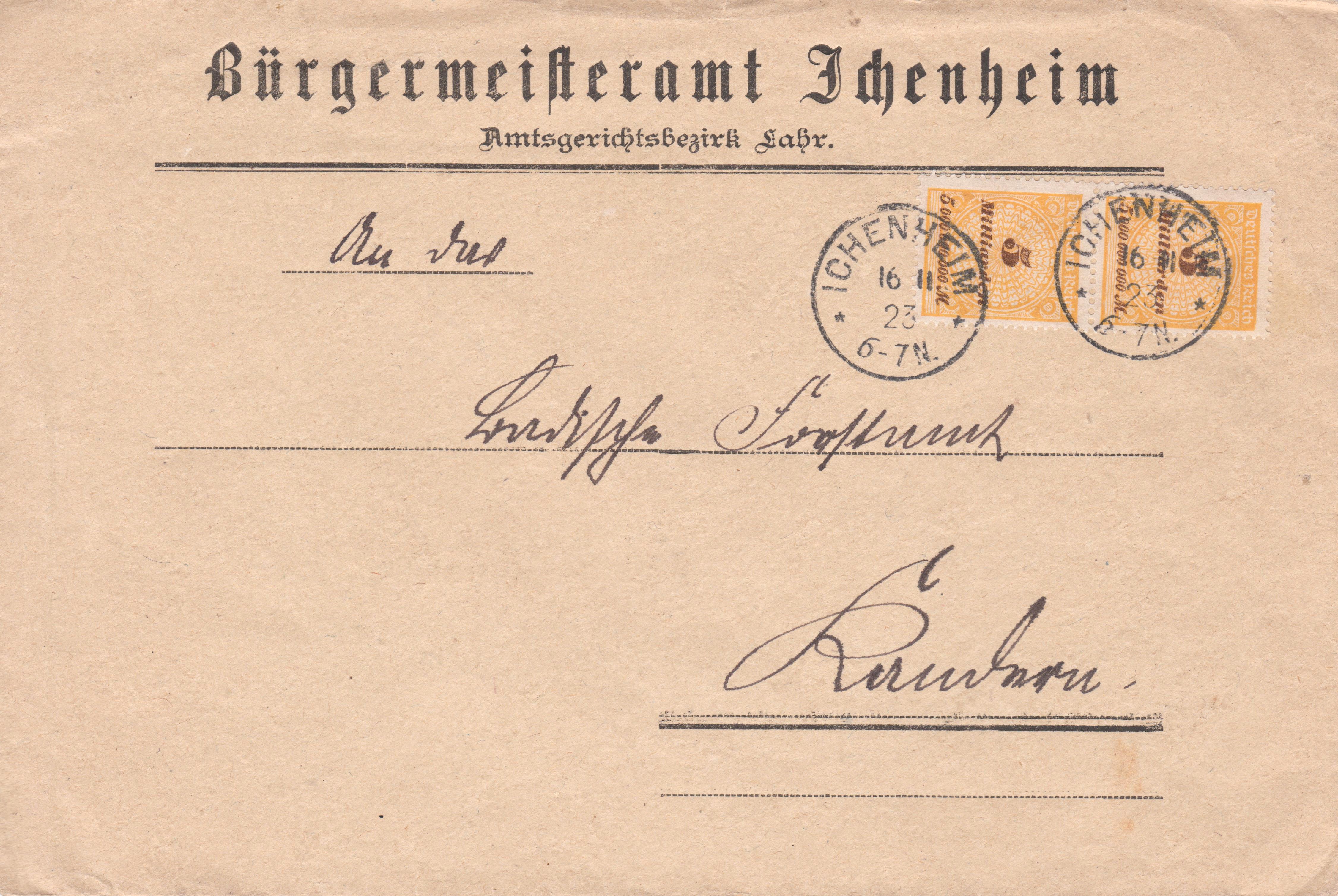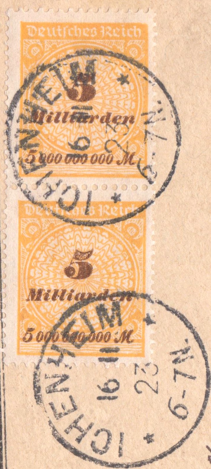 Vom 12.11.1923 bis zum 19.11.1923, also ganze 8 Tage lang, galt für einen Brief im Fernverkehr die hier als Mehrfachfrankatur mit einem Zweierstreifen der MiNr. 327 A P dargestellte Portostufe von 10 Milliarden Mark: