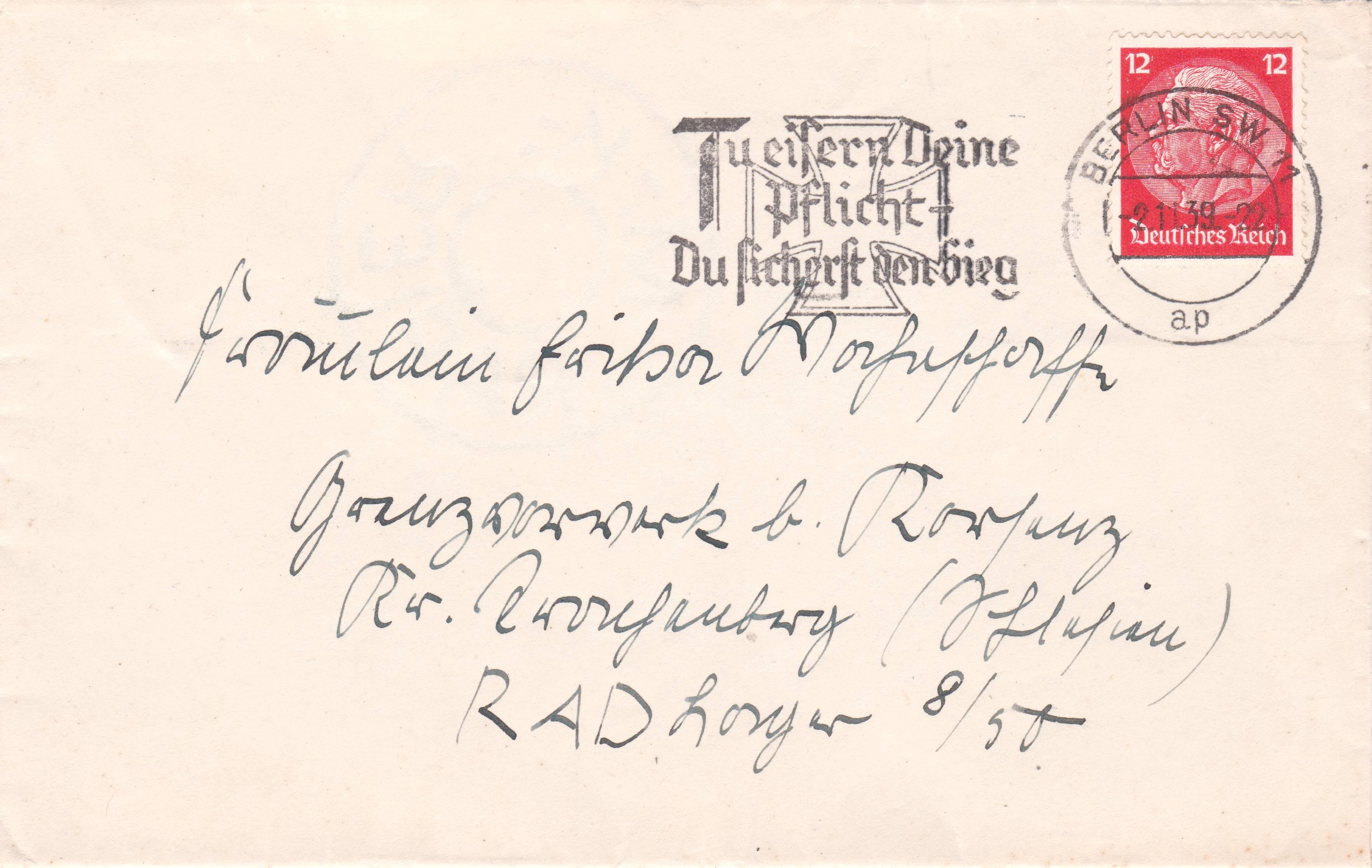 Brief im Fernverkehr, Portostufe 12 Pf, freigemacht per EF mit 12 Pf Dauerserie Hindenburg-Medaillon, entwertet mit Maschinenstempel BERLIN S.W. 11 mit Propaganda-Werbeeinsatz "Tu eisern Deine Pflicht - Du sicherst den Sieg":