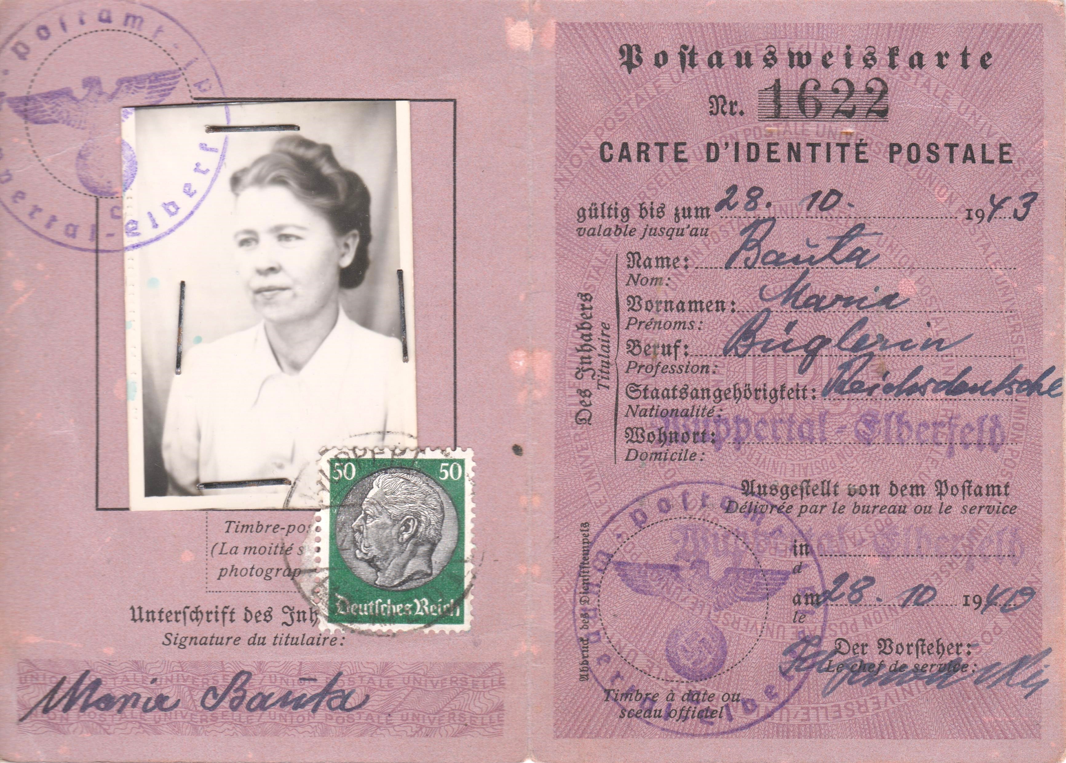 Einzelfrankatur 50 Pf Dauerserie Hindenburg-Medaillon am 28.10.1940 auf Postausweiskarte WUPPERTAL-ELBERFELD: