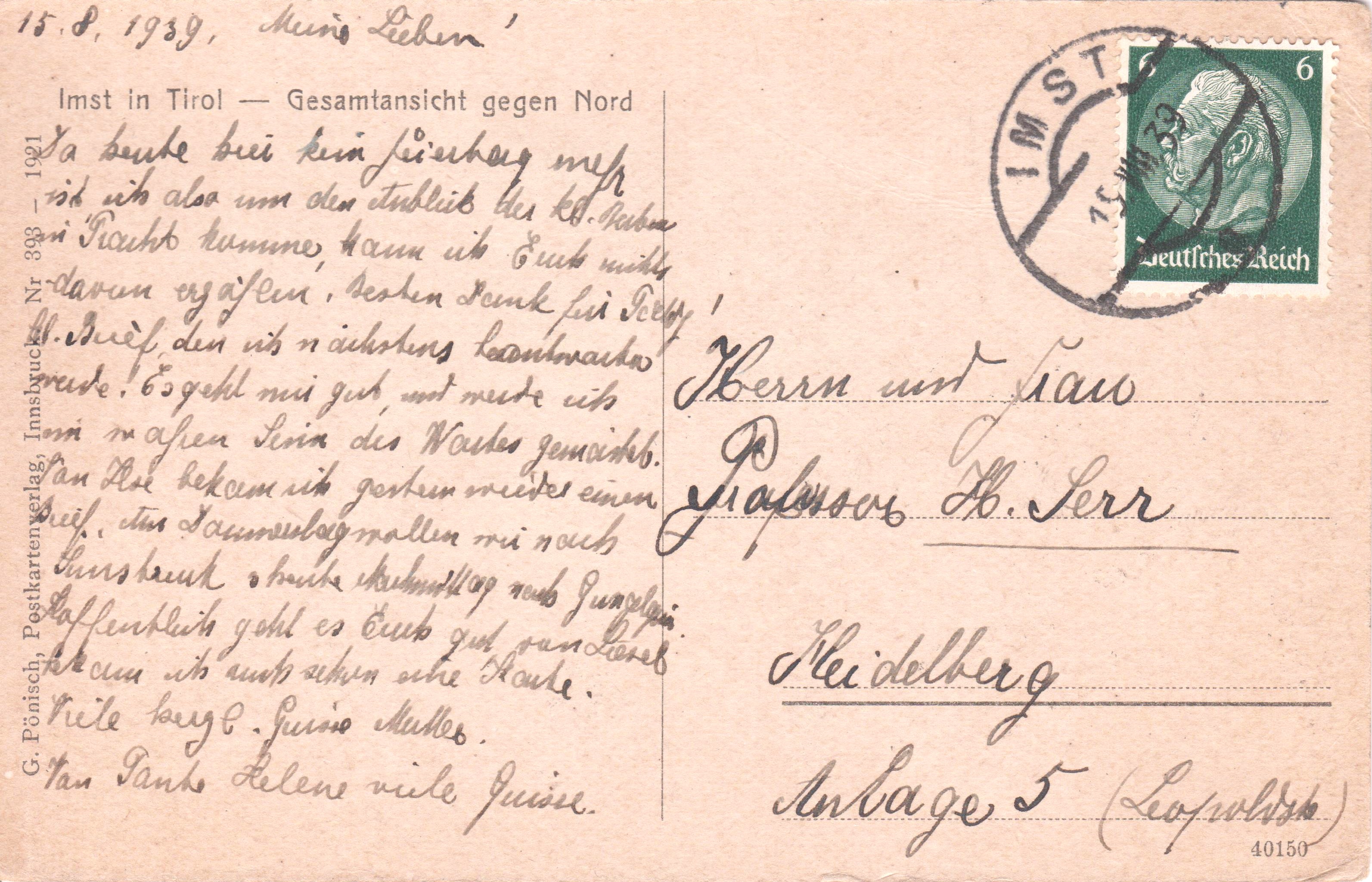 Postkarten 6 Pf am 15.VIII.1939 sowie 31.VIII.1939 aus IMST in Tirol adressiert nach "Heidelberg (Baden)":