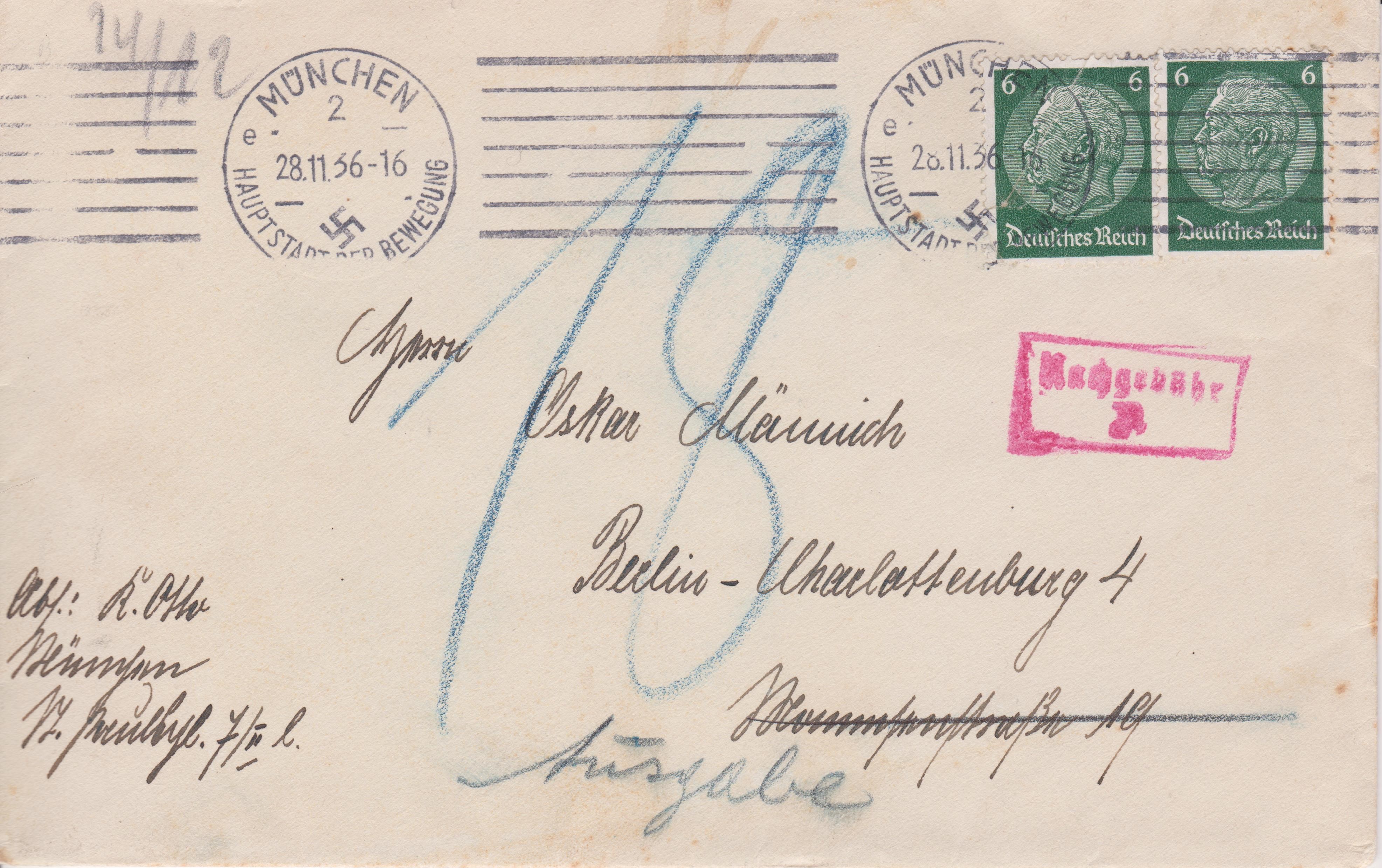 Brief adressiert nach "Zürich Schweiz", Portostufe 75 Pf, freigemacht per Mischfrankatur mit 40 Pf, 25 Pf sowie 10 Pf Kontrollrat Ziffernserie, entwertet am 17.03.1947 mit aptiertem Tagesstempel MÜNCHEN 2 ba, aus dem der Zusatz "Hauptstadt der Bewegung" entfernt worden war: