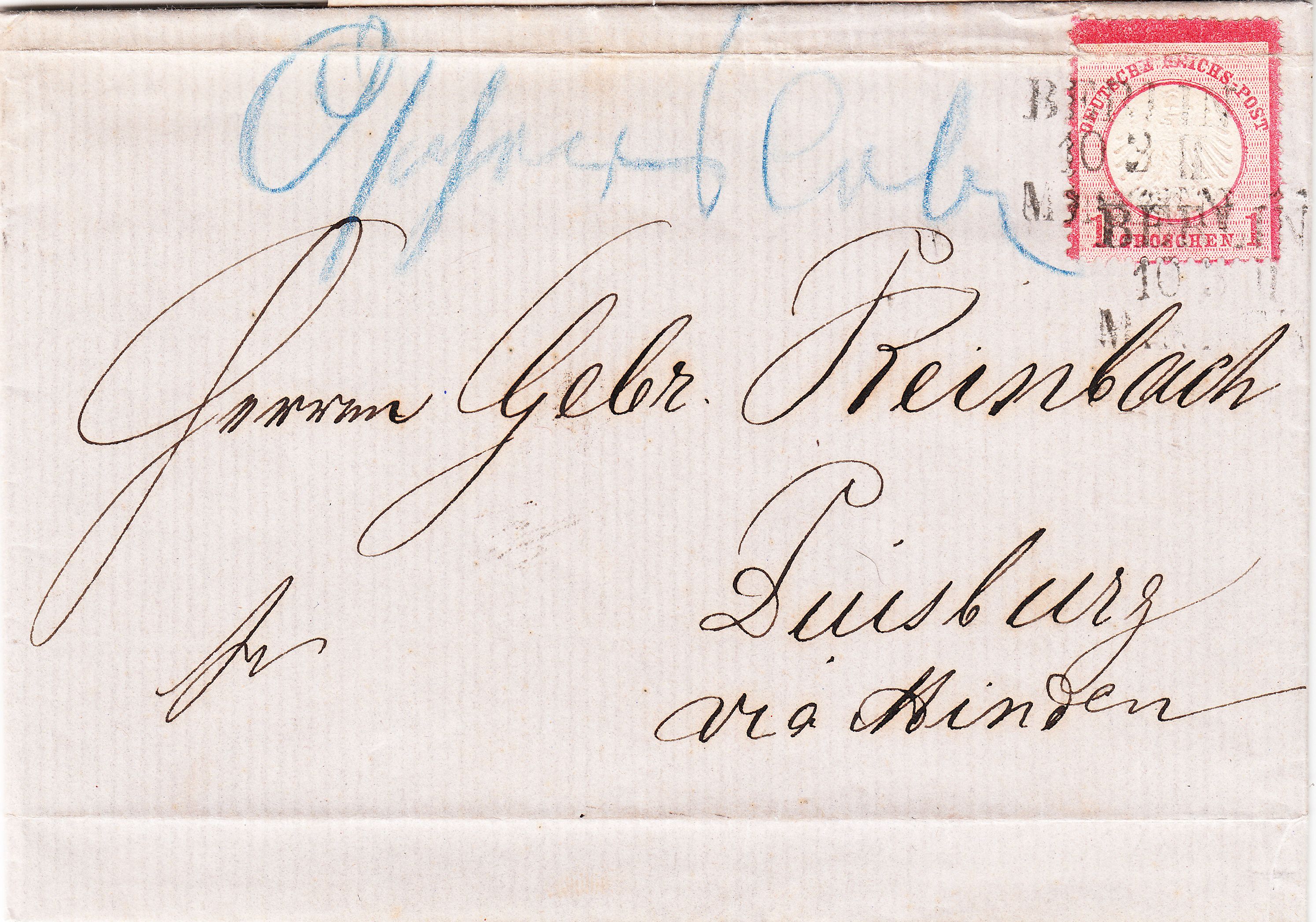 Die Adresse lautet "Duisburg via Minden". Den gewünschten Leitweg dokumentiert der nachverwendete preussische dreizeilige Kursstempel "BERLIN 10 3 II MINDEN", die Ankunft in "DUISBURG" dokumentiert am 10.03.1872 abends ein nachverwendeter preussischer Zweikreisstempel: