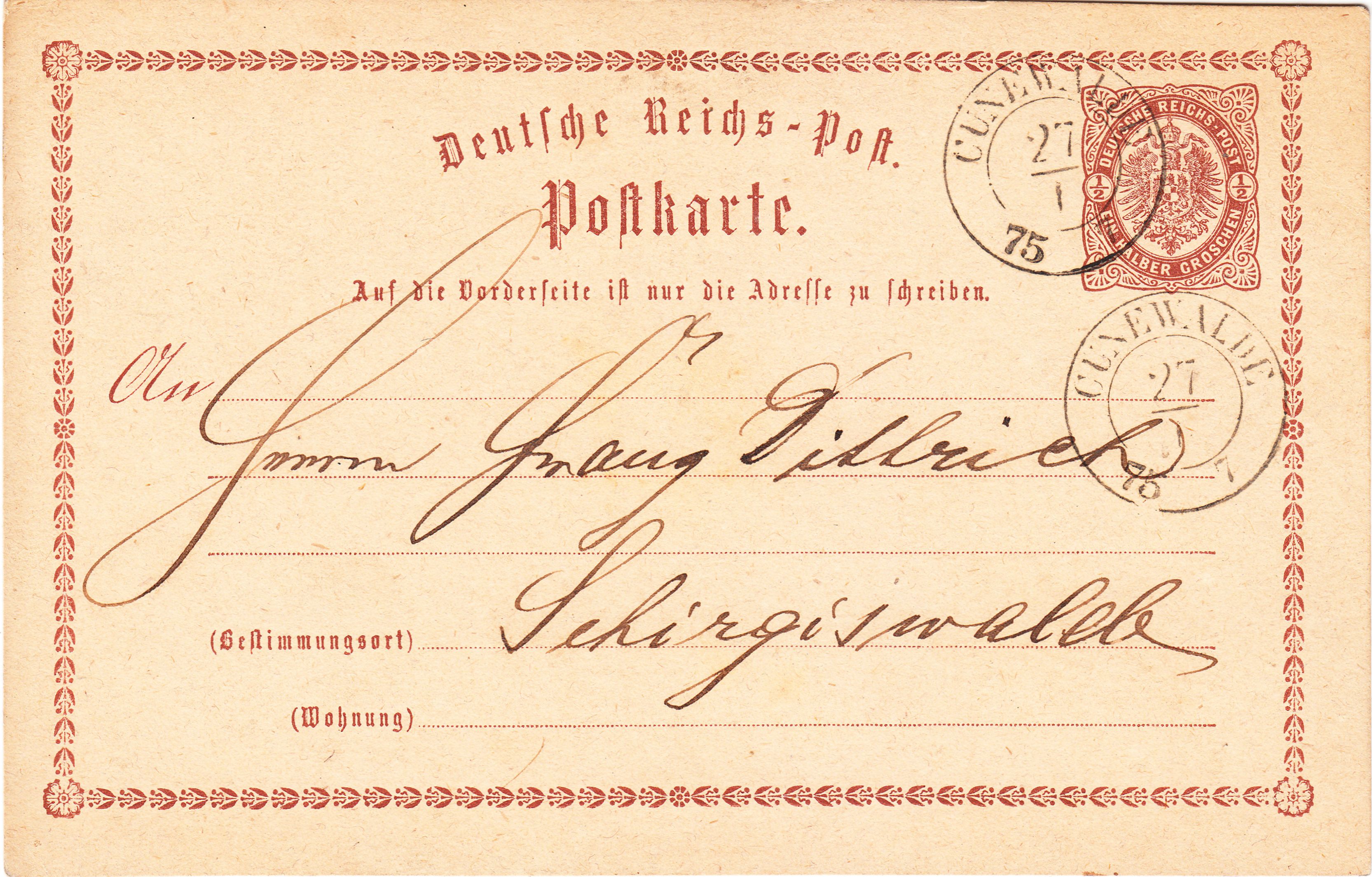 Diese nach "Schirgiswalde" adressierte Ganzsache MiNr. P 1 wurde am 27.01.1875, also während der Zeit der Markwährung, abends um "7" = 19 Uhr per nachverwendetem sächsischem Zweikreisstempel CUNEWALDE entwertet: