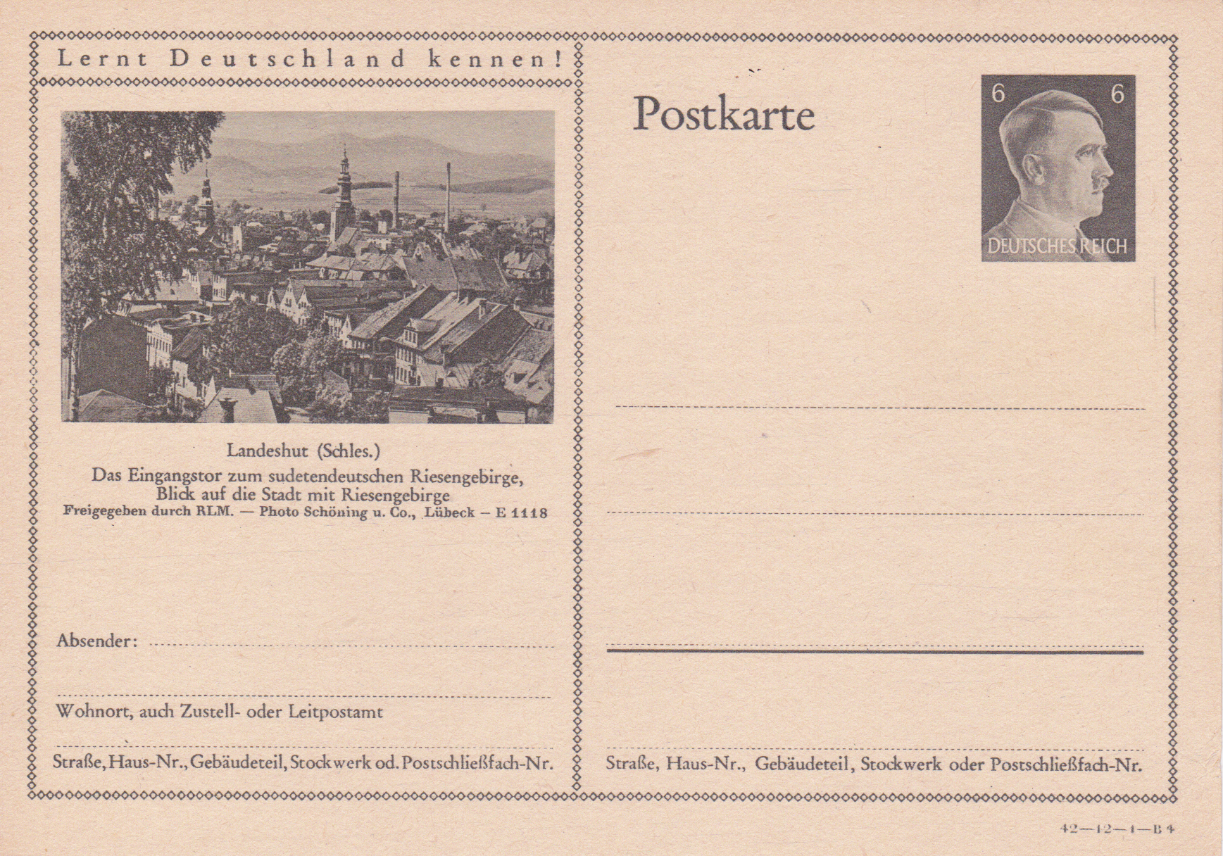 Auf dieser Karte (Serie 12 Bild 4) sehen wir ein Foto mit einem Blick auf Landeshut (Schlesien) und dem Riesengebirge im Hintergrund. Landeshut heißt heute Kamienna Góra und ist eine Kreisstadt in der Woiwodschaft Niederschlesien in Polen.
