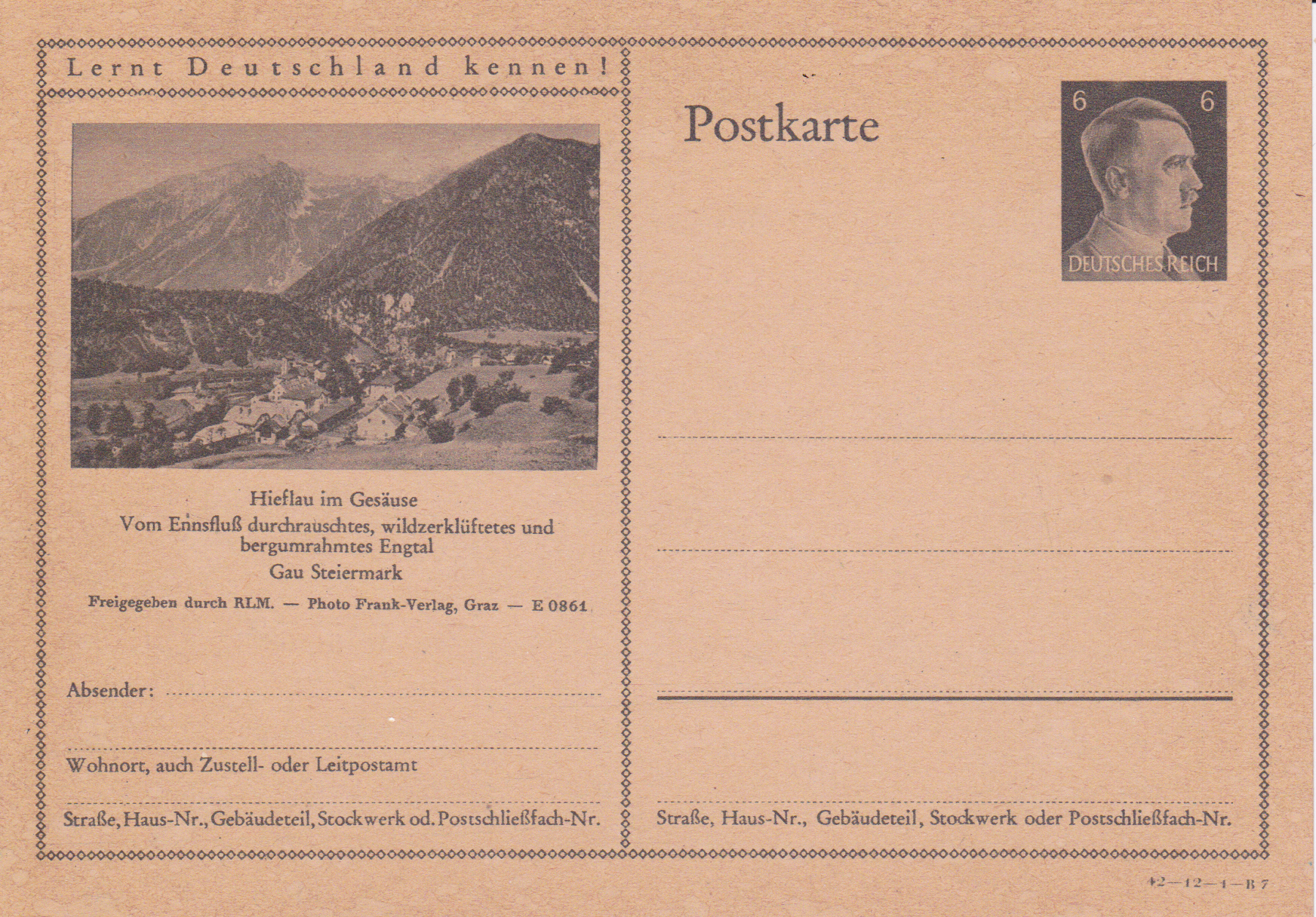 Auf dieser Karte (Serie 12 Bild 7) zeigt Hieflau im Gesäuse (eine Gebirgsgruppe in den Nördlichen Kalkalpen) eine Ansicht des Dorfes in der Steiermark.
