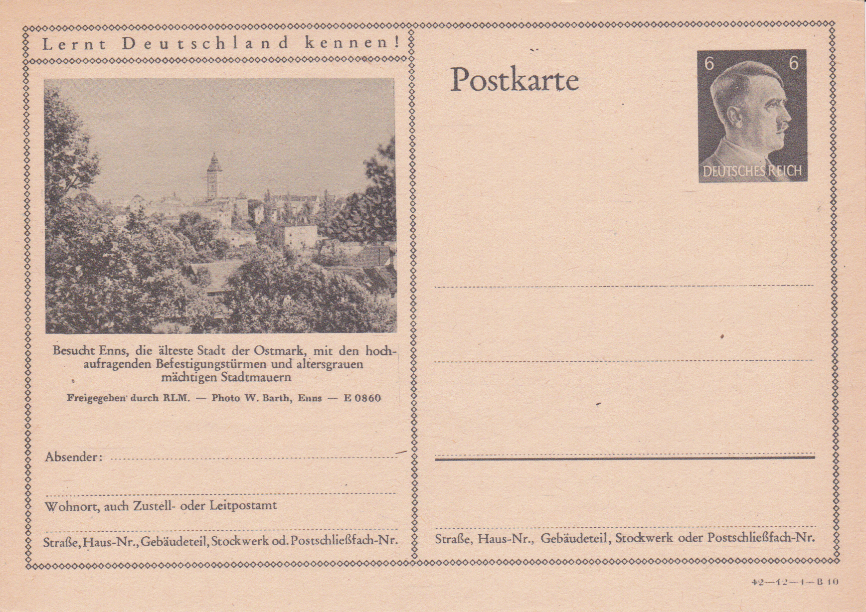 Enns, eine Stadt in Oberösterreich, zeigt auf dieser Karte (Serie 12 Bild 10) ein Foto der Stadt. Der Stadtturm von Enns ist deutlich in der Mitte des Bildes erkennbar.
