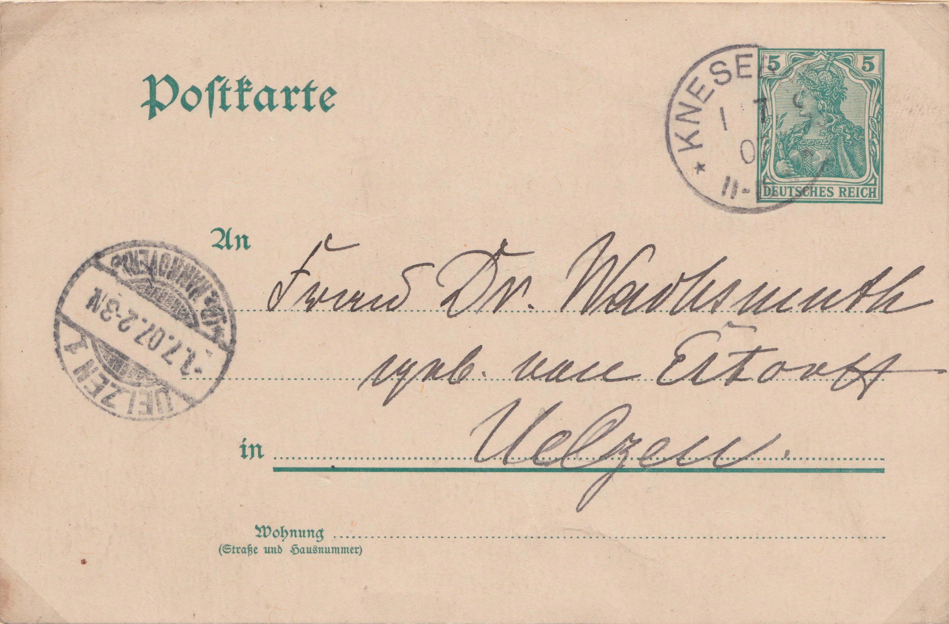 Ganzsache Germania 5 Pf, MICHEL P 73 mit Wasserzeichen "DR/II/6", aufgegeben am 01.07.1907 in KNESEBECK: