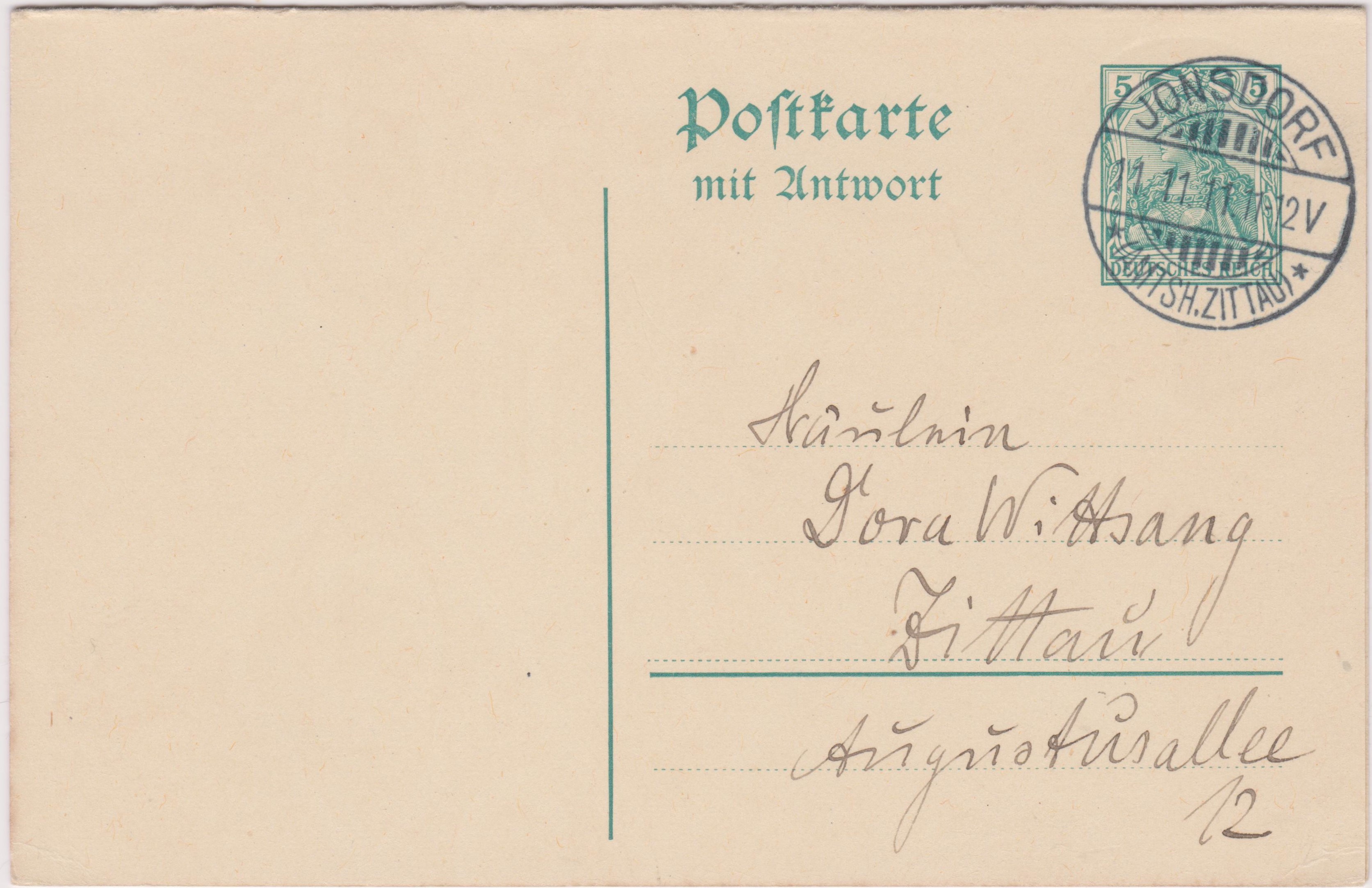 Ganzsache Germania 5 Pf "Postkarte / mit Antwort", MICHEL P 92 mit Wasserzeichen "DR/II/9", aufgegeben am 11.11.1911 in JONSDORF: