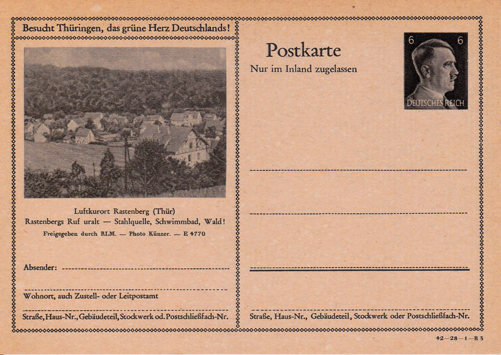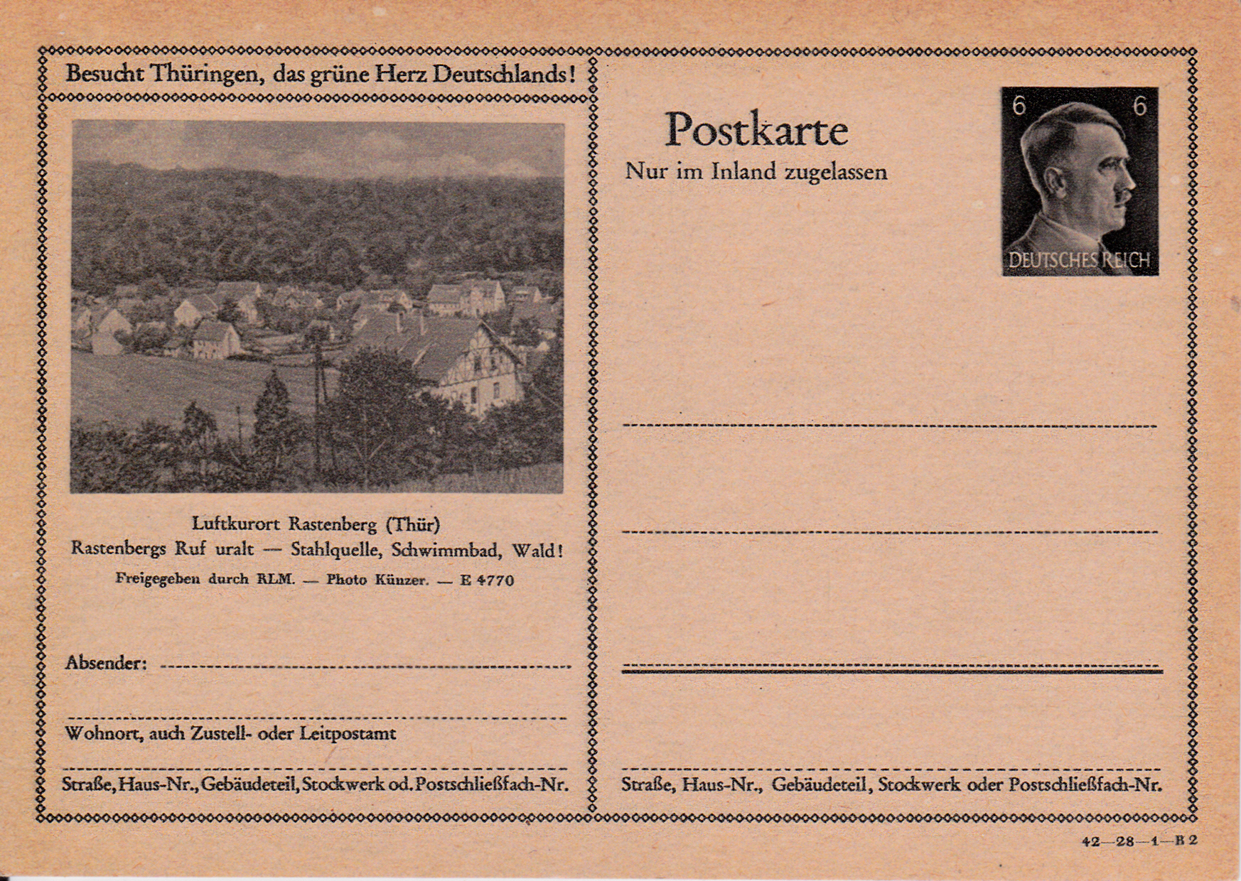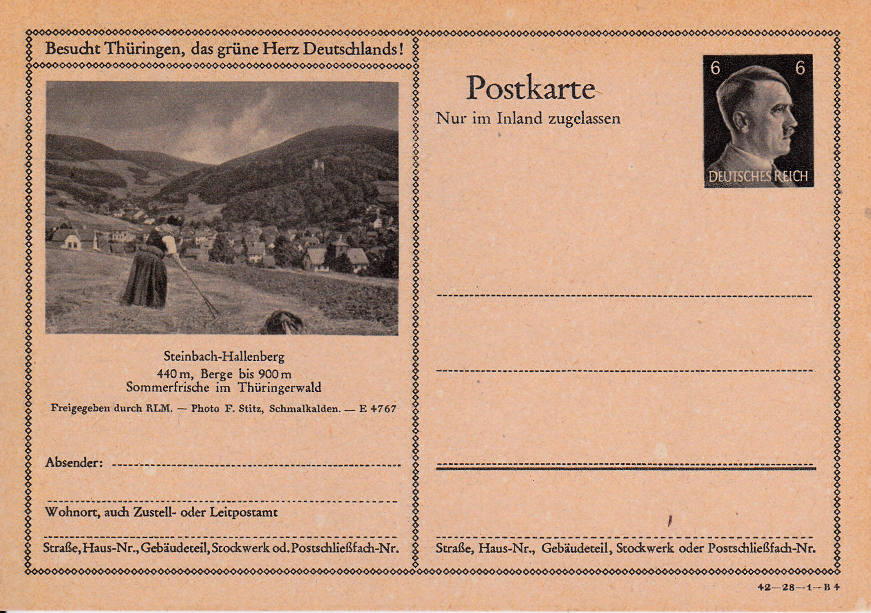Einen Blick auf Steinbach-Hallenberg in Thüringen mit der Ruine Hallenburg auf dem etwa 80 m hohen, nach drei Seiten hin steil abfallenden Porphyrfelsen am Arnsberg zeigt uns das Foto dieser Karte (Serie 28 Bild 4).