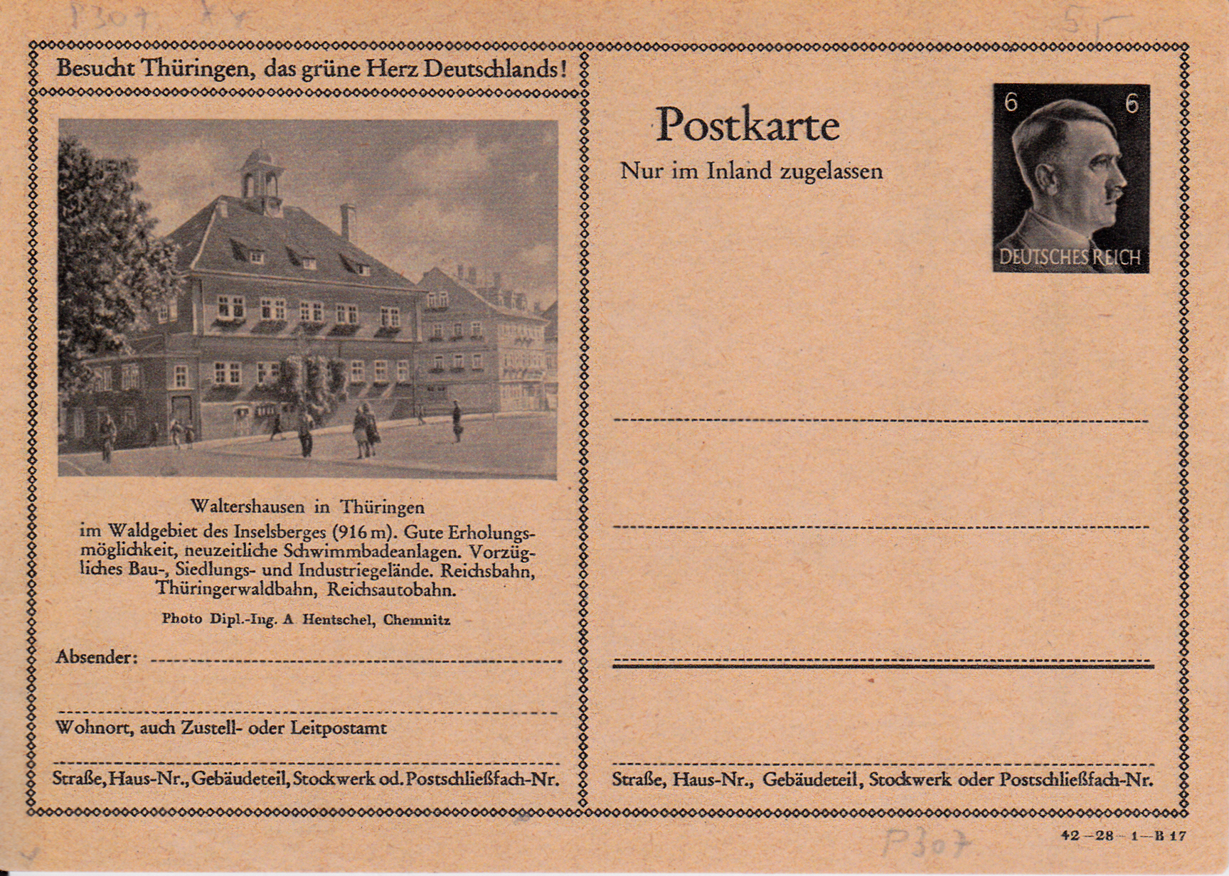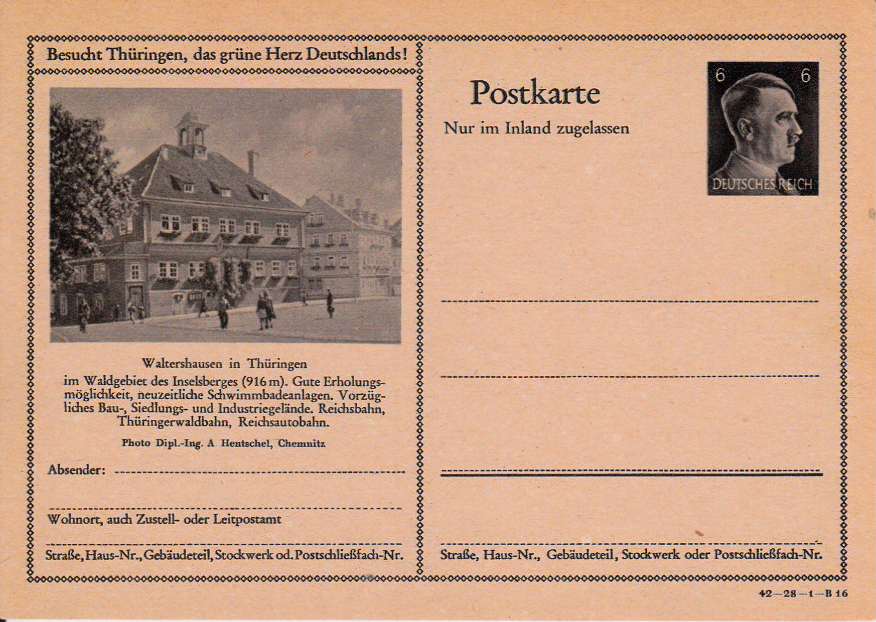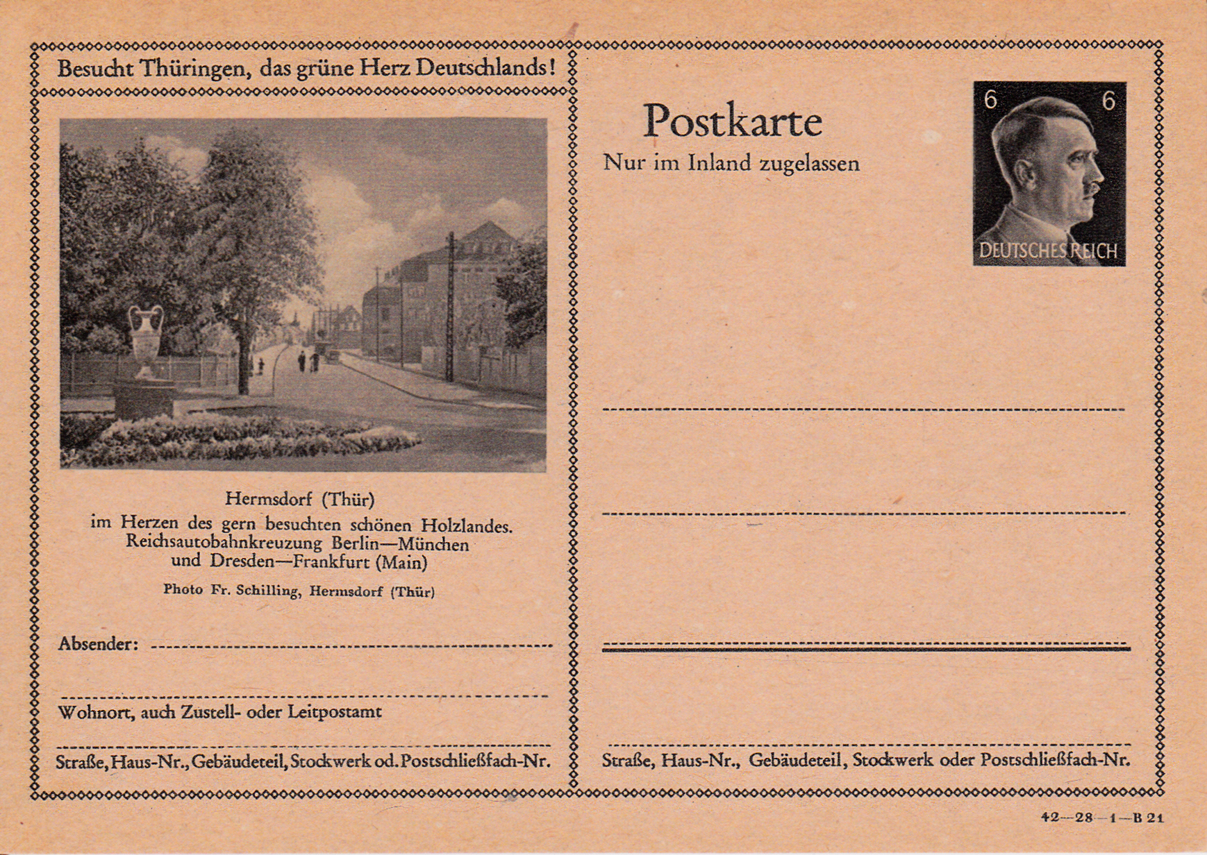 Hermsdorf (Thüringen) zeigte eine Ansicht einer Straße auf dieser Karte (Serie 28 Bild 20) und weist auf seine Lage am Autobahnkreuz ("Hermsdorfer Kreuz").