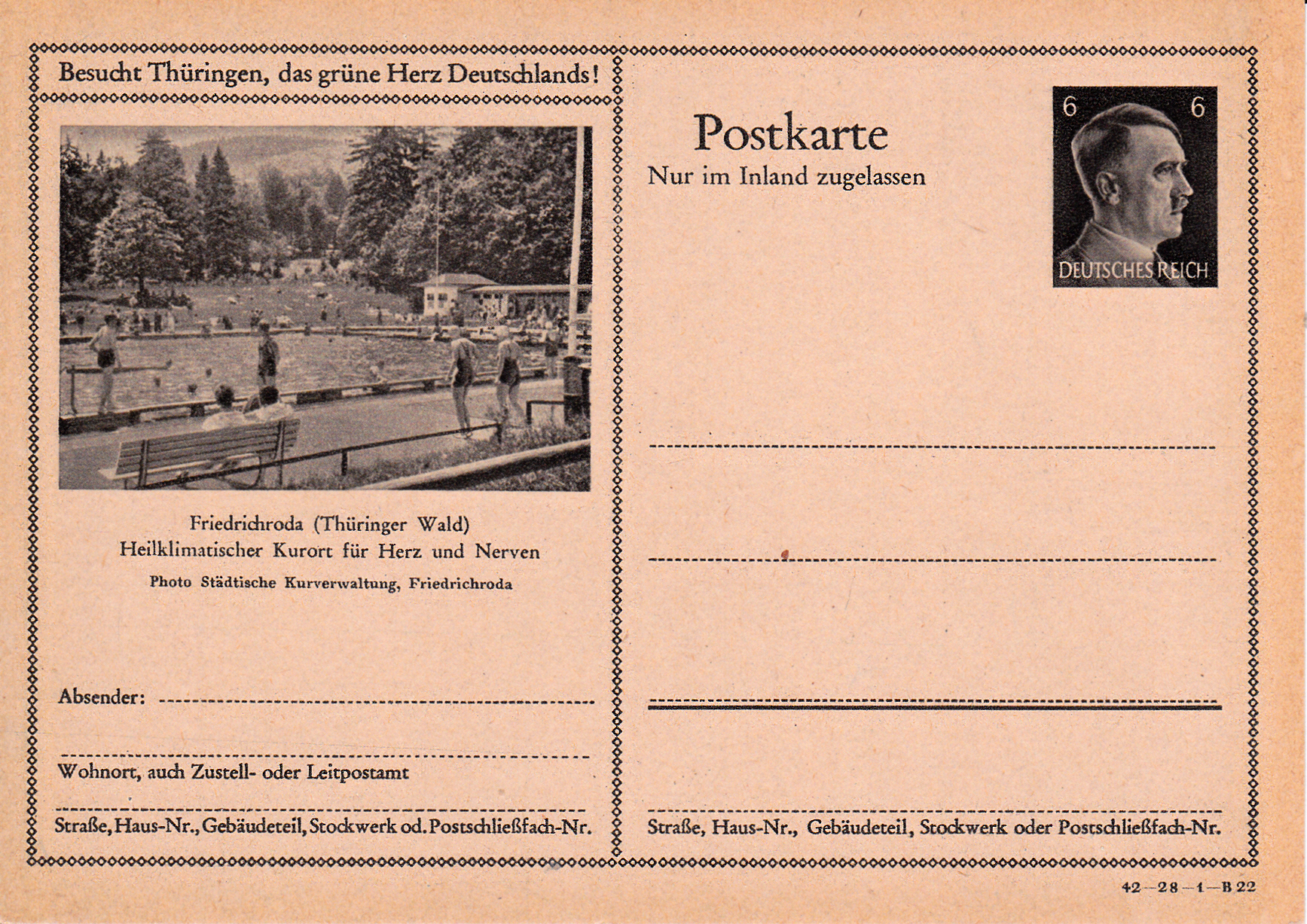 Friedrichroda (Thüringer Wald) ist mit dieser Bildpostkarte 1942 (Serie 28 Bild 22) mit seinem Freibad wie in den vorangegangenen Jahren wieder dabei.