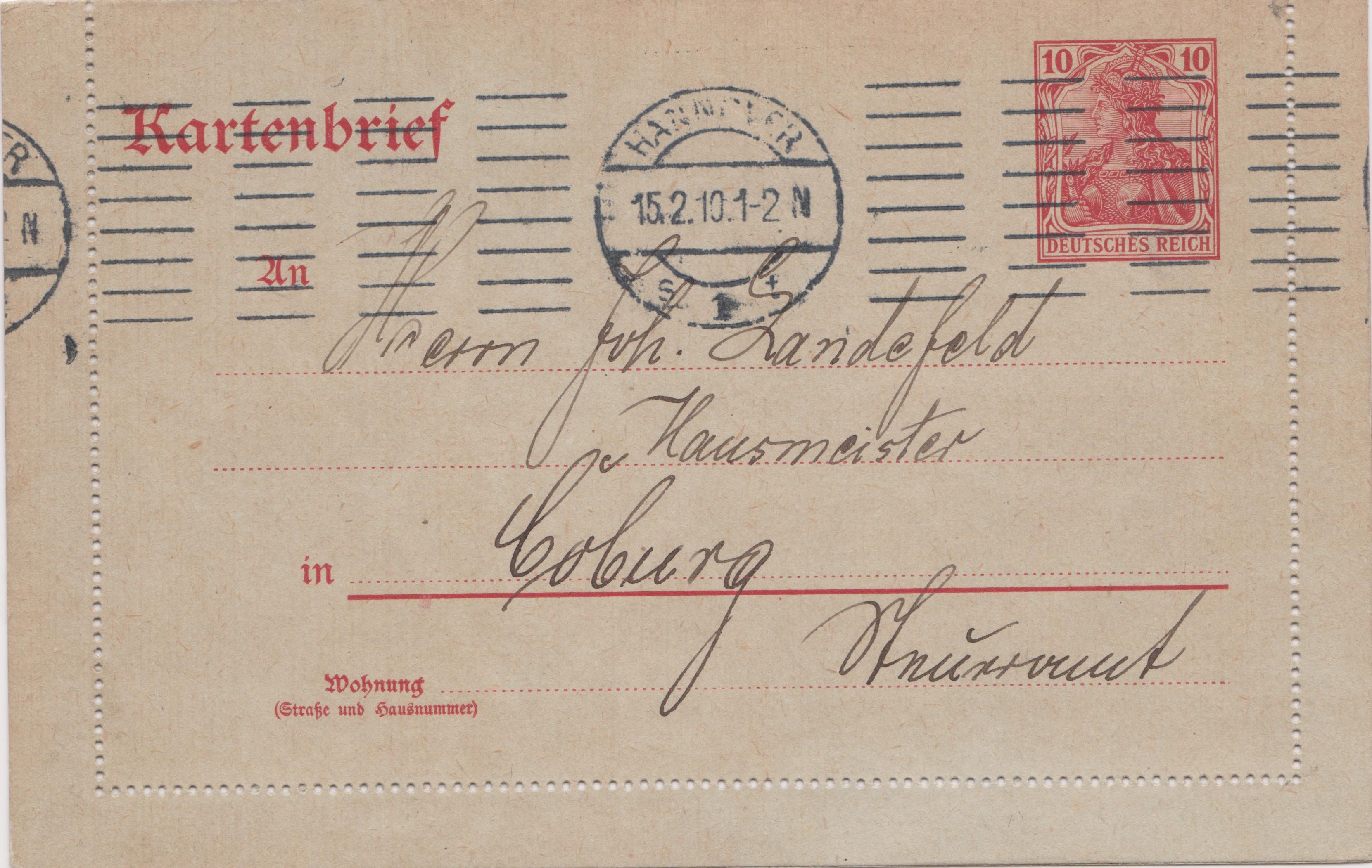 Das Porto betrug lediglich 10 Pf, aber der Absender hatte vermutlich lediglich die dem Briefporto im Inland entsprechenden Postwertzeichen zu 15 Pf verfügbar, weshalb er diese Postkarte damit frankierte. Die Entwertung erfolgte mit Stempel "CÖLN - GIESSEN BAHNPOST Z. 643" (Z. = Zug).