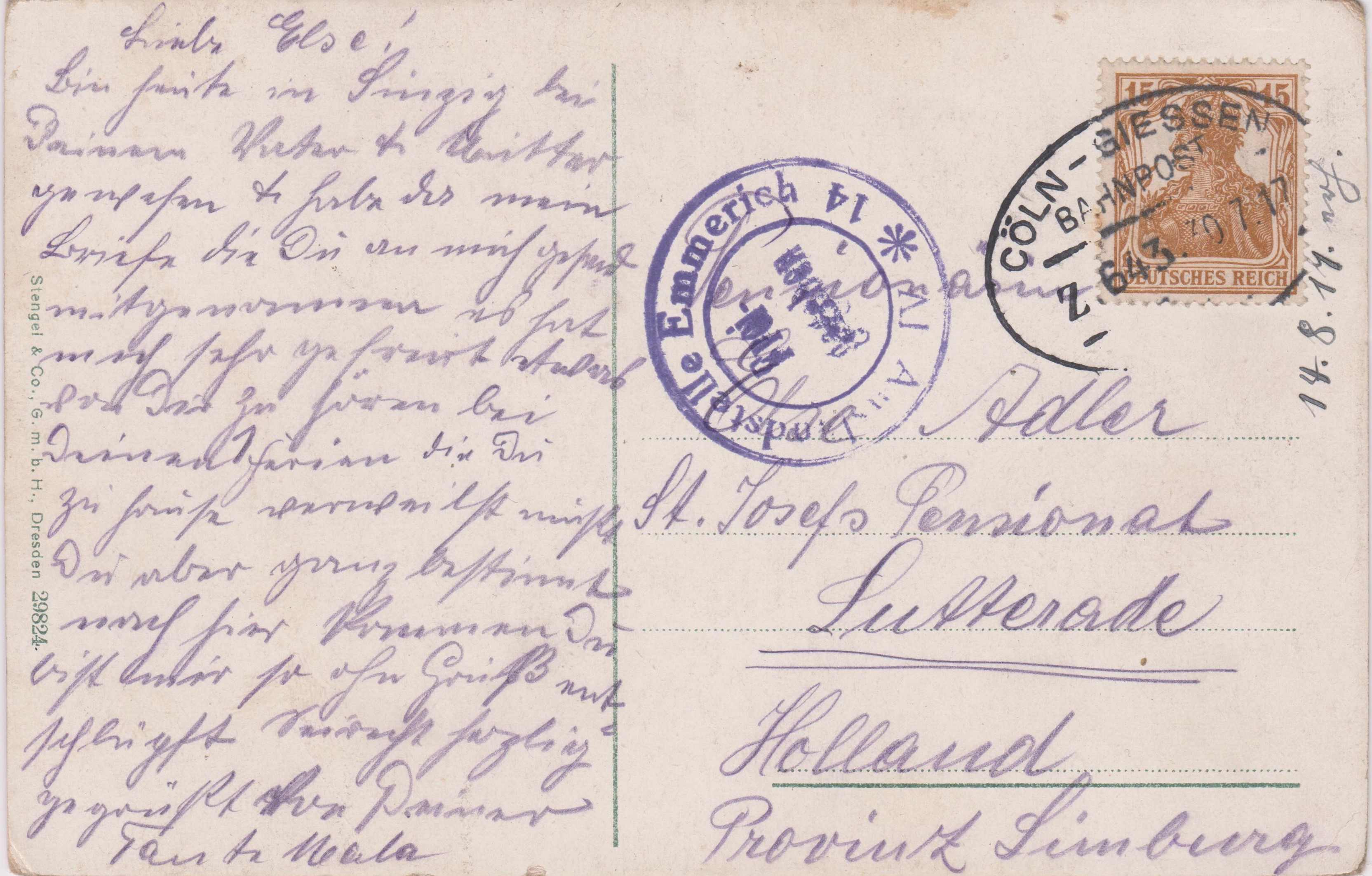 Diese Postkarte nach Holland wurde am 30.07.1917 freigemacht per Einzelfrankatur einer Germania 15 Pf, MiNr. 100 a:
