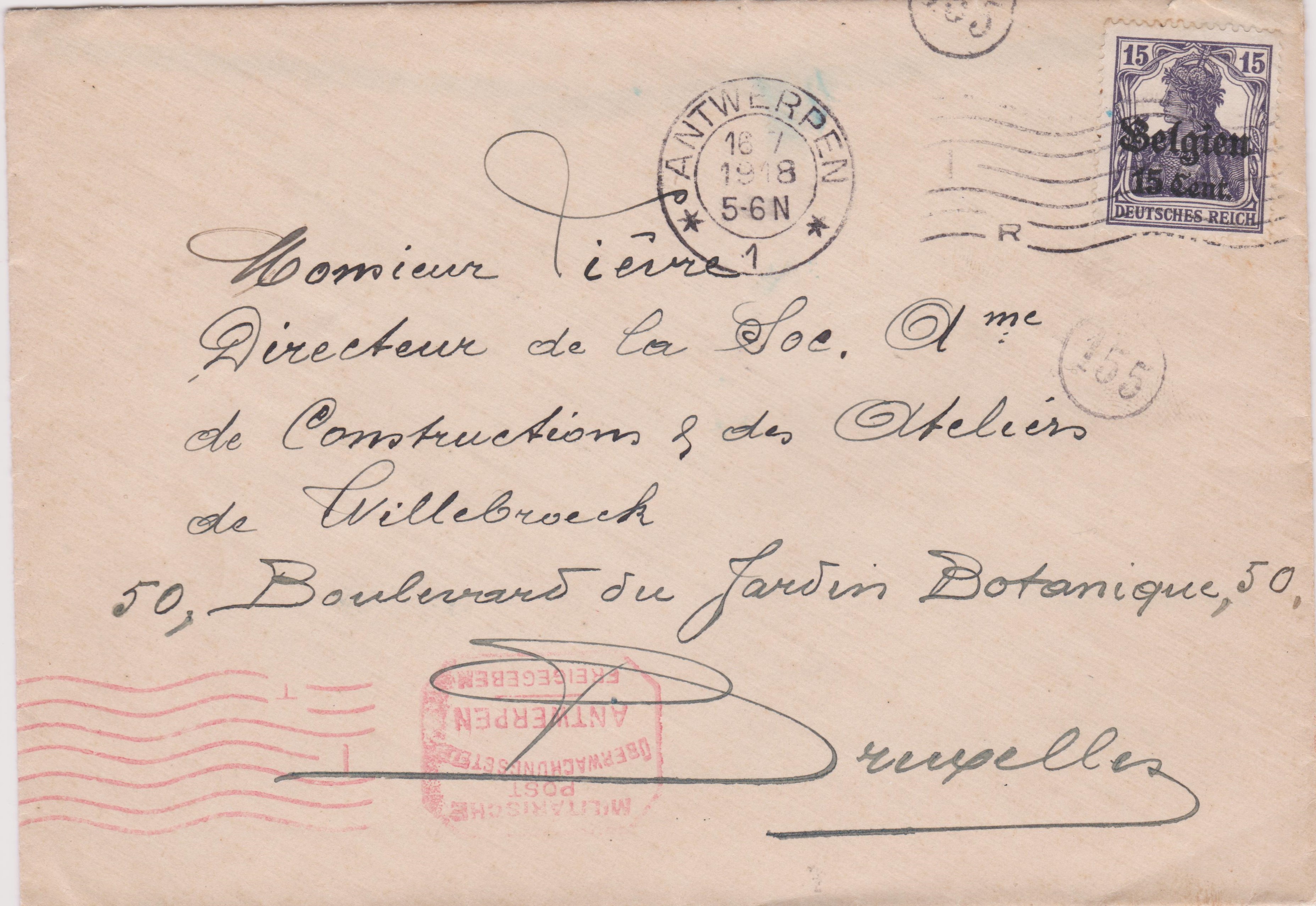 Dieser Beleg wurde freigegeben durch die "Militärische Überwachungsstelle Antwerpen", was ein achteckiger Maschinenstempeleinsatz neben 7 Wellenlinien in Rot dokumentiert.