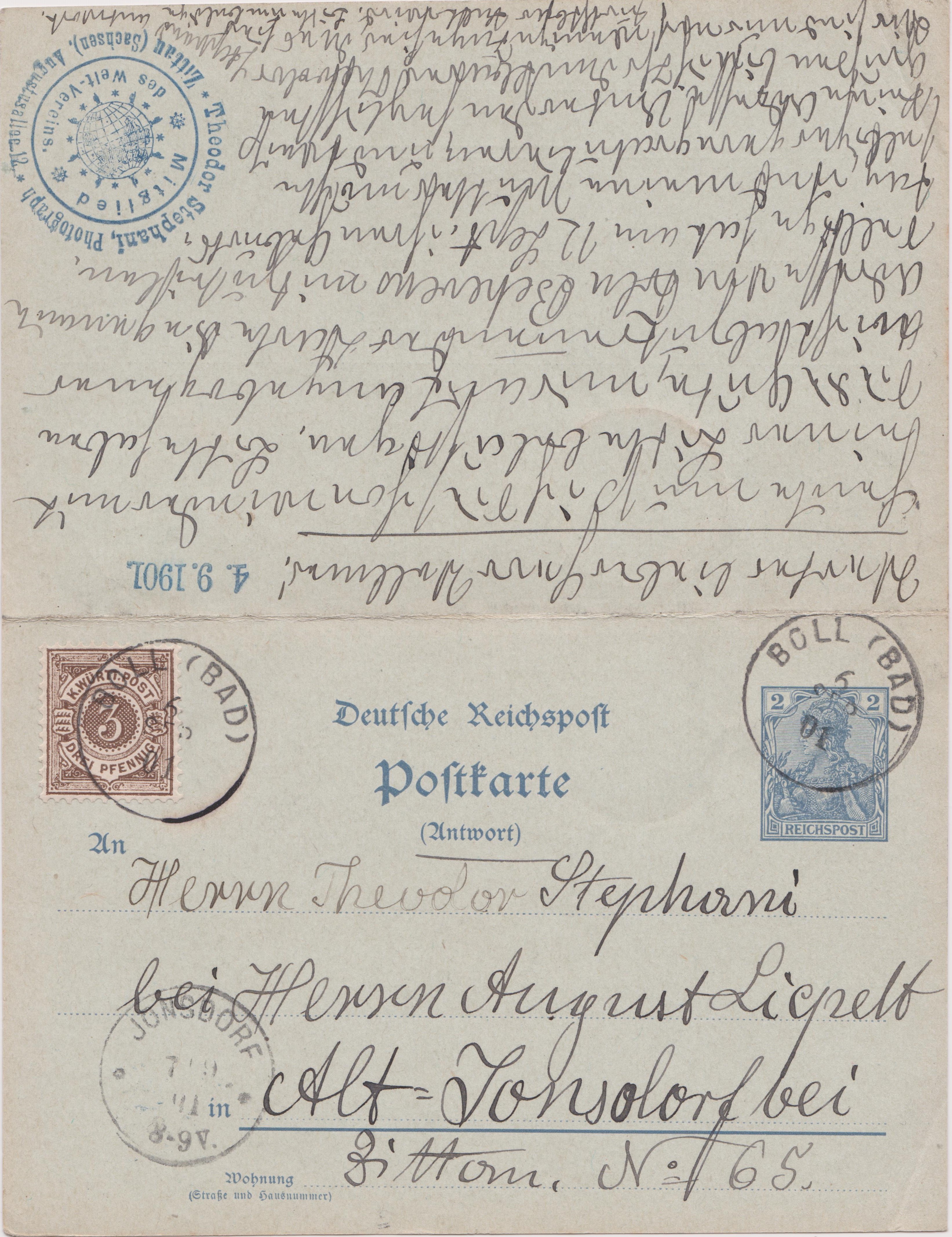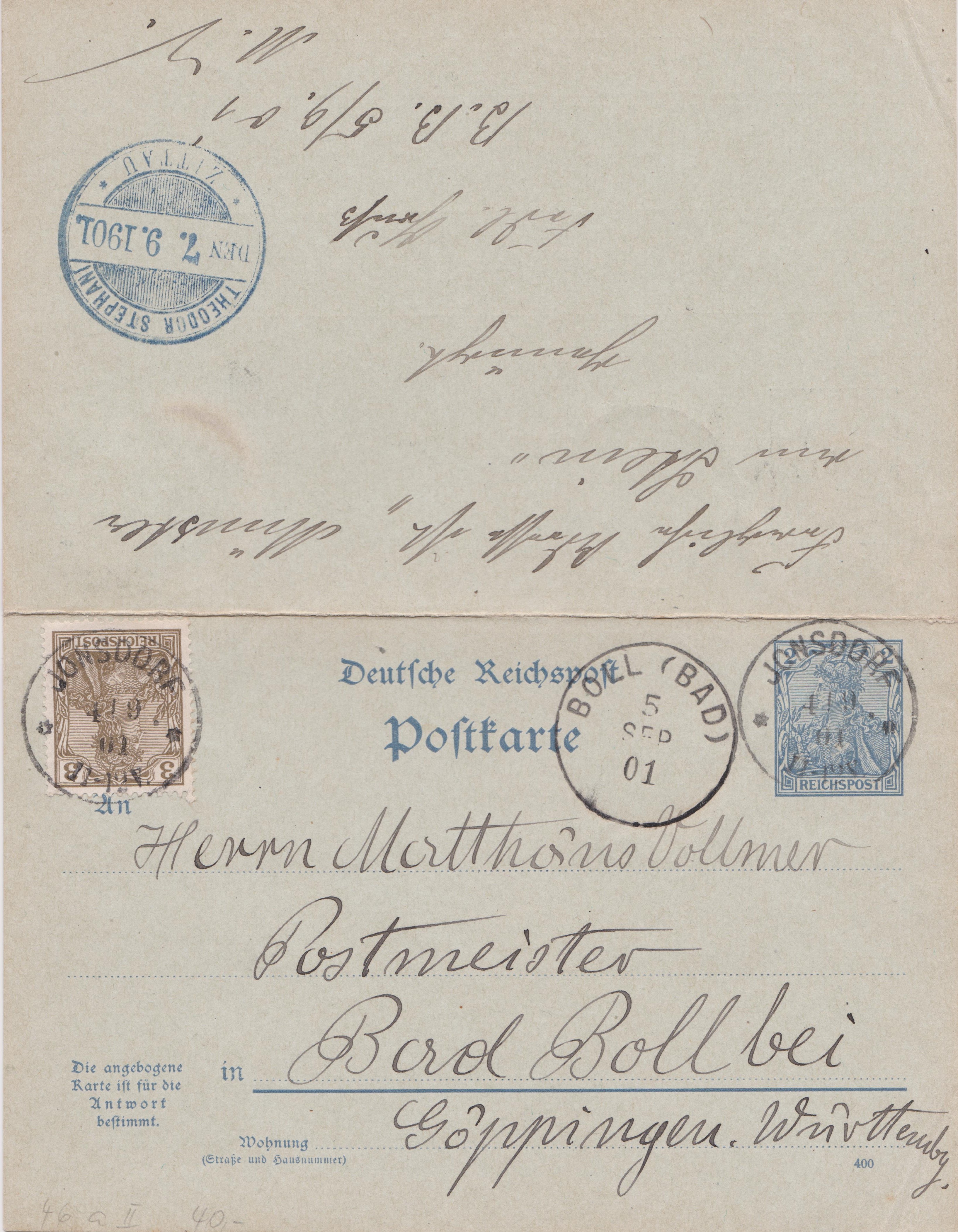 Der Antwortteil wurde am 06.09.1901 in BAD BOLL in Württemberg mit einer Zusatzfrankatur von 3 Pf versehen und nach "Alt-Johnsdorf bei Zittau" zurück geschickt, wo der Beleg am 07.09.1901 wieder ankam: