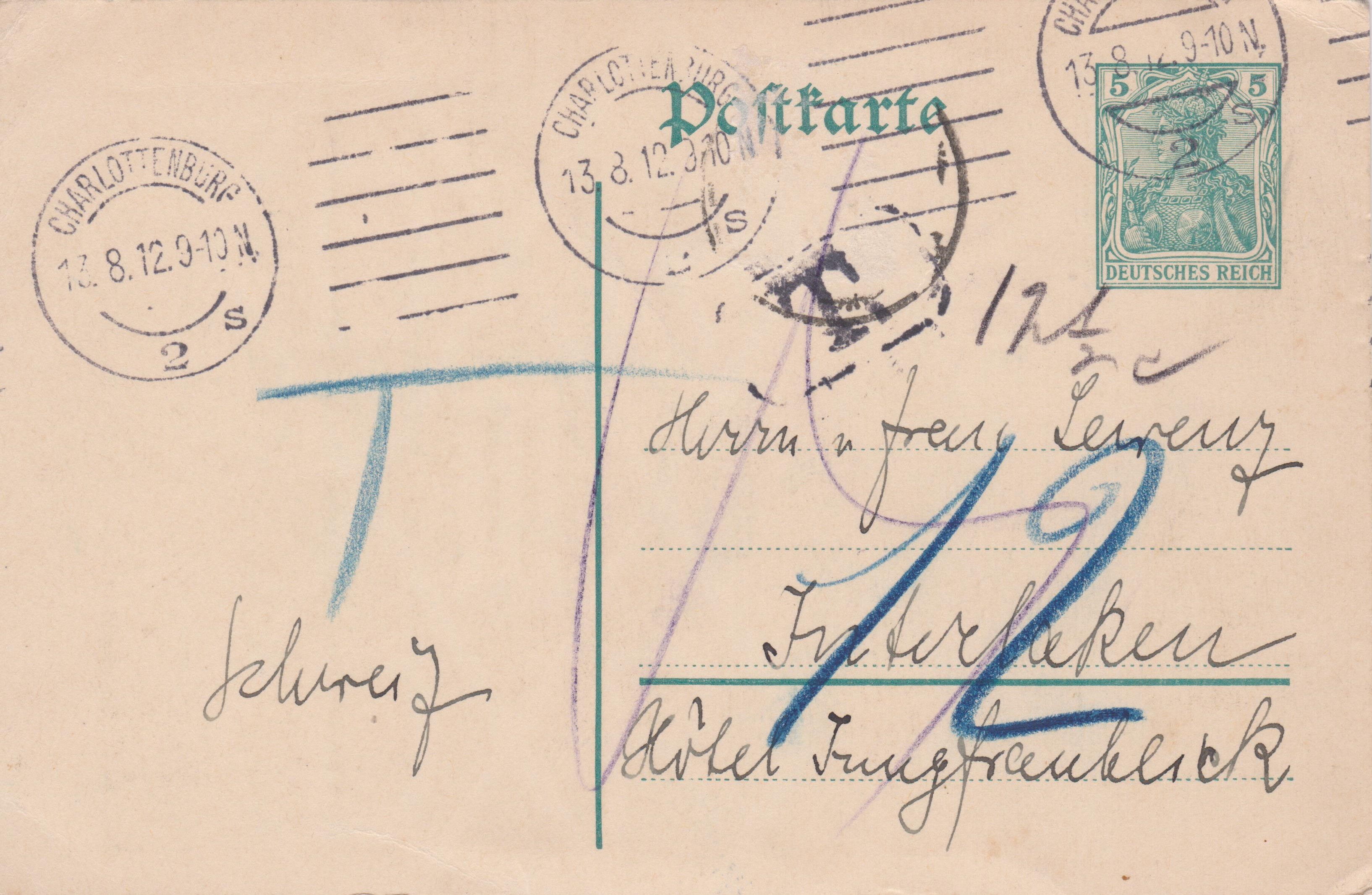 Das Porto für eine Postkarte in die Schweiz betrug nicht 5 Pf, sondern "10" Pf, wie handschriftlich ausgewiesen. Dementsprechend wurde in Charlottenburg ein Taxstempel "T" mit dem handschriftlichen Vermerk "12 1/2 c" angebracht, indem das Fehlporto von 5 Pf mit dem Faktor 2,5:1 in französische Centimes umgerechnet wurde. In der Schweiz wurde ein handschriftlicher Vernmerk "T" in Blau vorgenommen und das Fehlporto in "12" Rappen umgerechnet, die vom Empfänger zu zahlen waren.