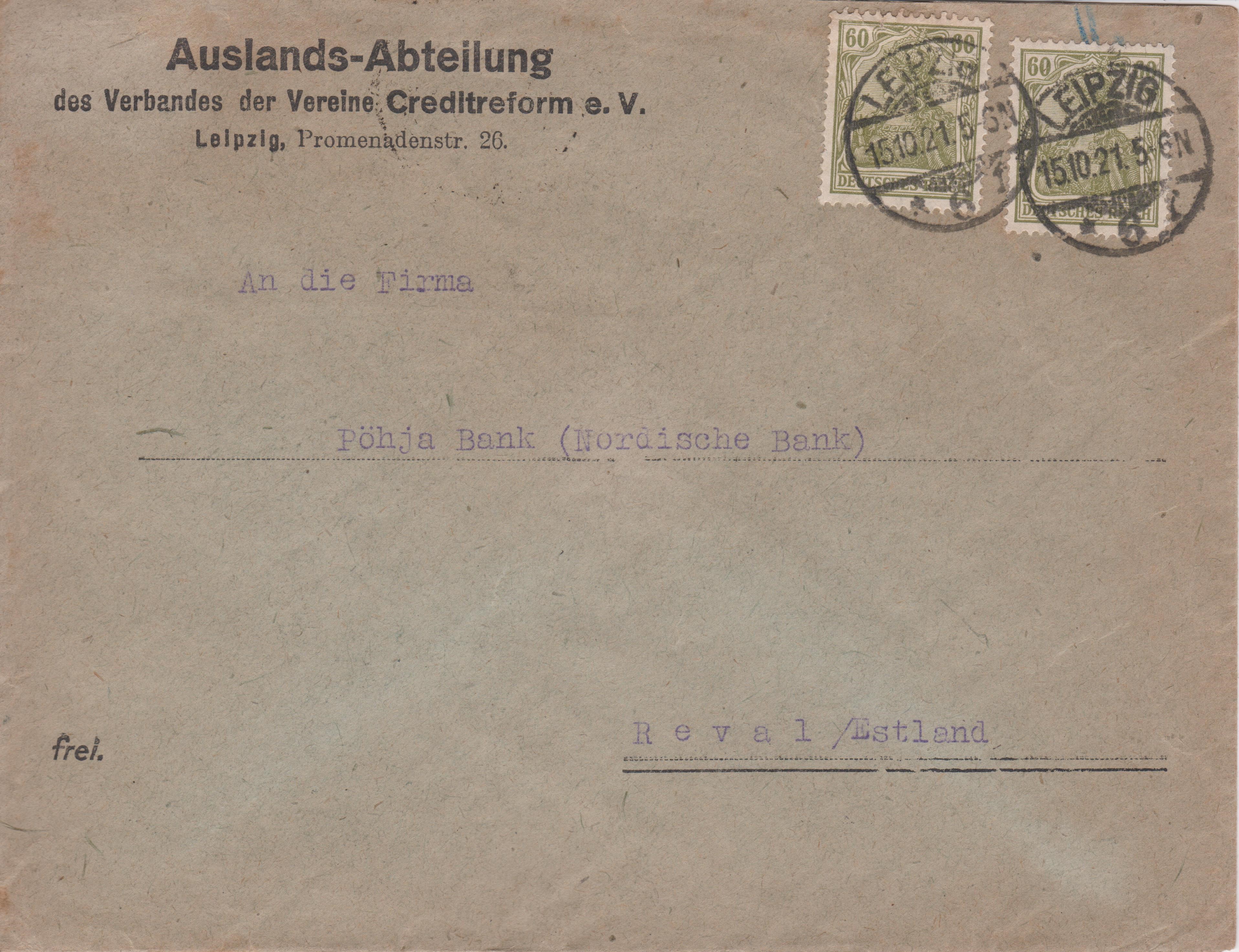 Mehrfachfrankatur 60 Pf Germania am 15.10.1921 portogerecht auf Auslandsbrief bis 20 g nach "Reval/Estland":