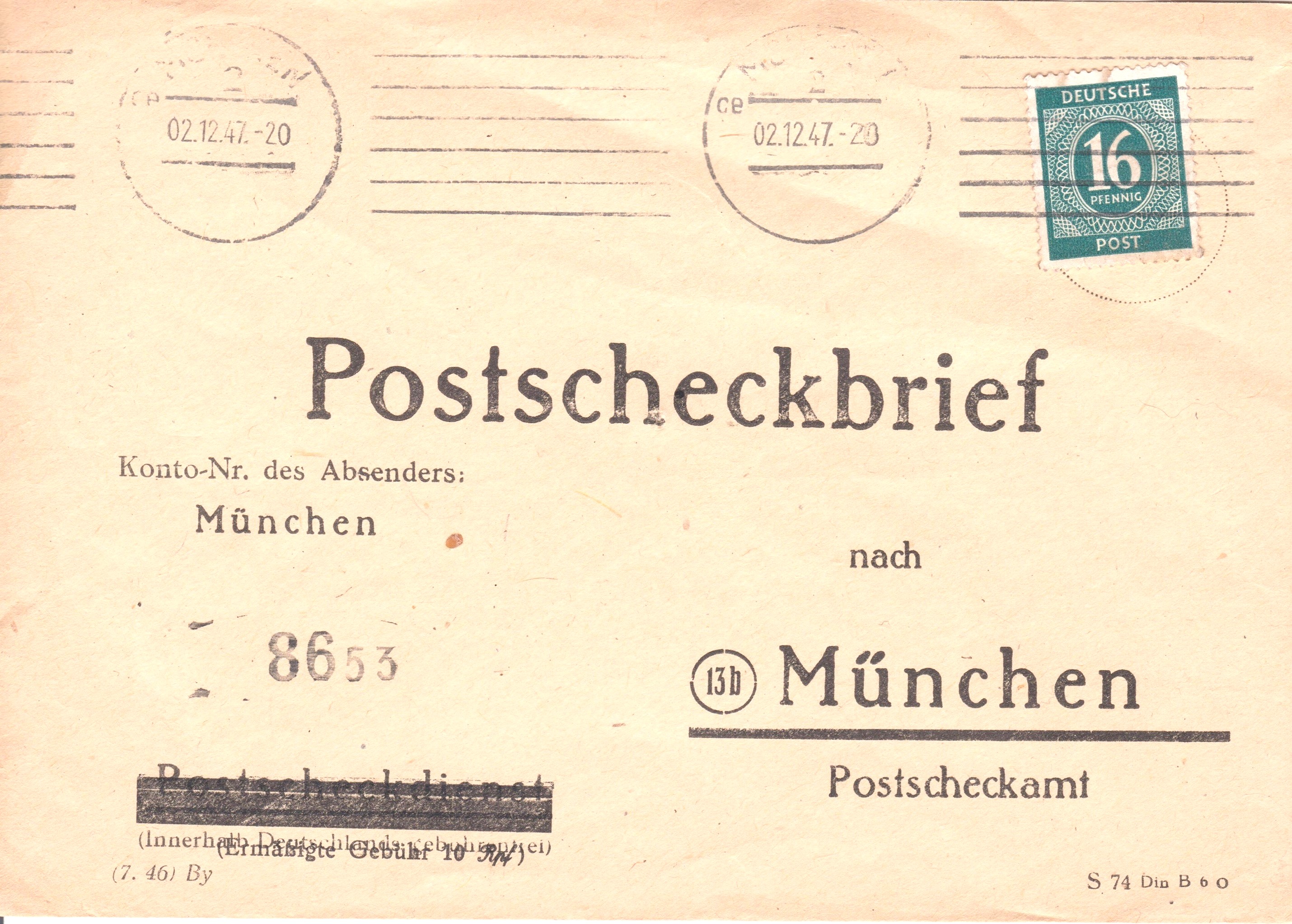 Portogerechten EF der MiNr. 923 auf "Postscheckbrief" (= Ortsbrief) am 02.12.1947 in München gelaufen: