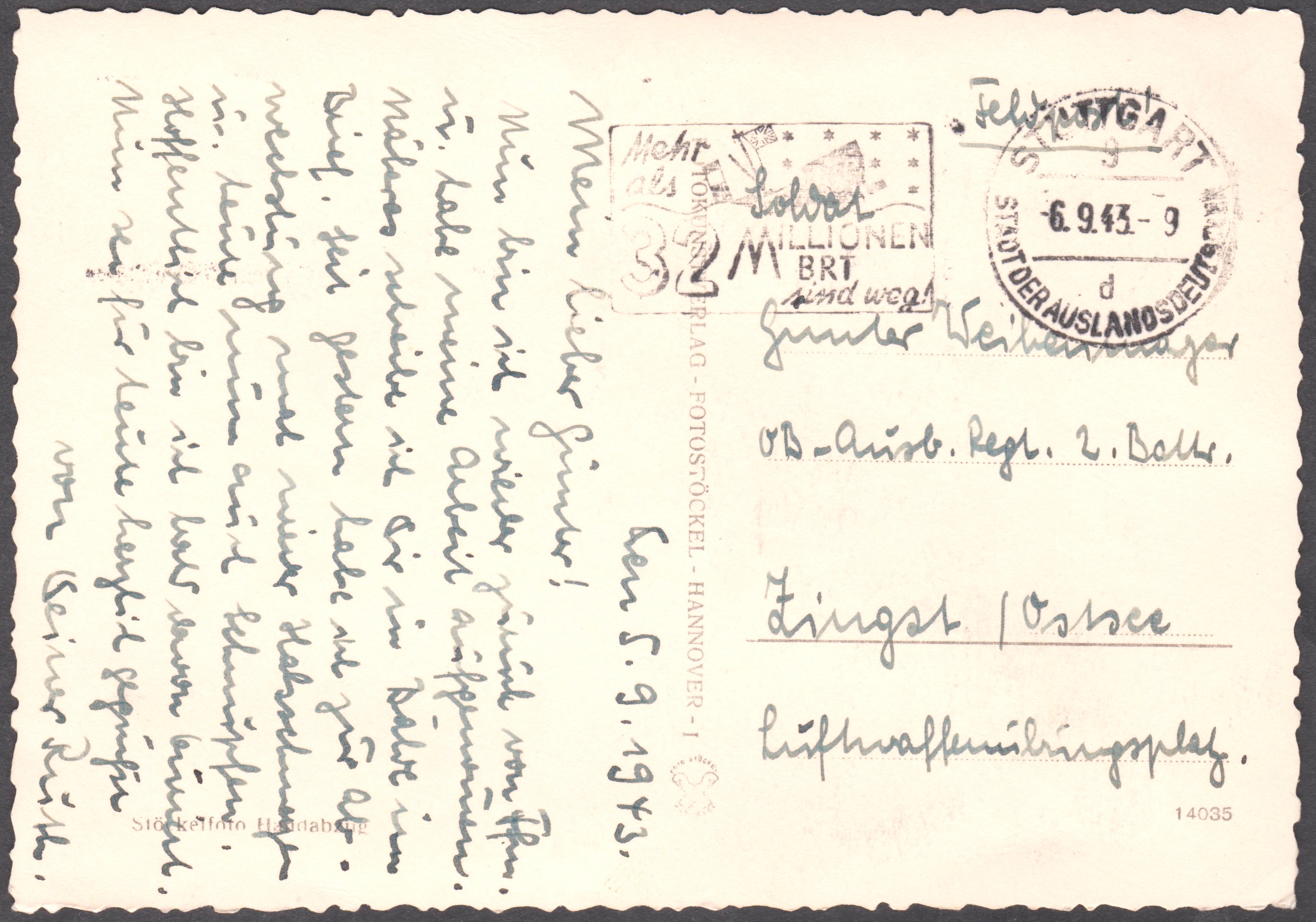 Feldpostkarte sowie Feldpostbrief mit Maschinenstempel STUTTGART 9 d STADT DER AUSLANDSDEUTSCHEN mit Porpagandaeinsatz "Mehr als 32 MILLIONEN BRT sind weg!":