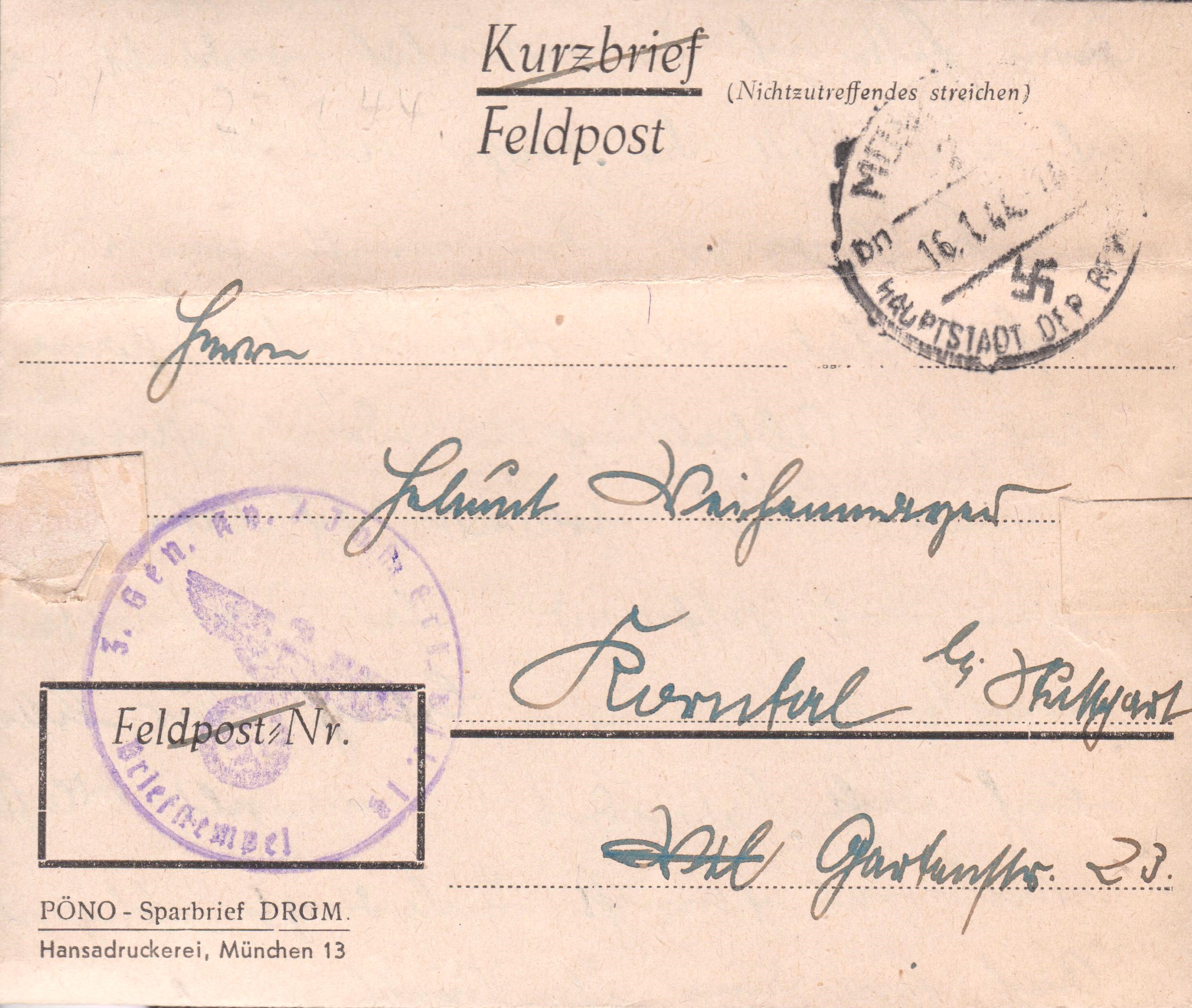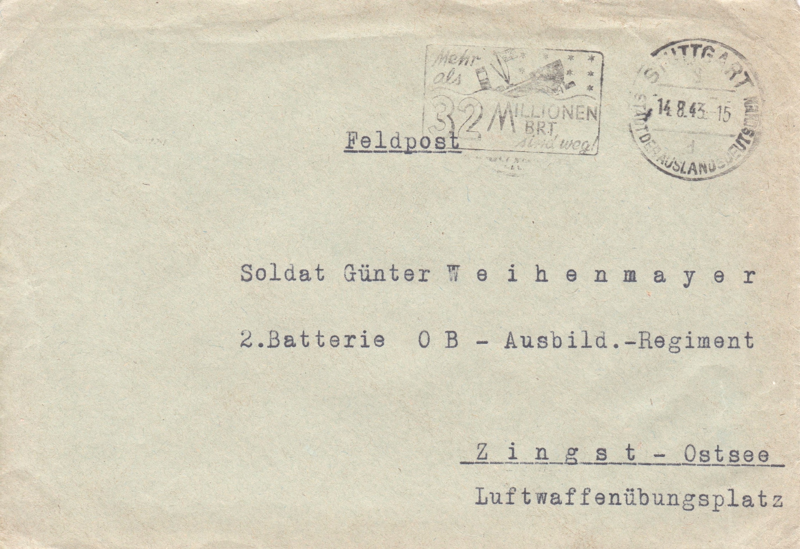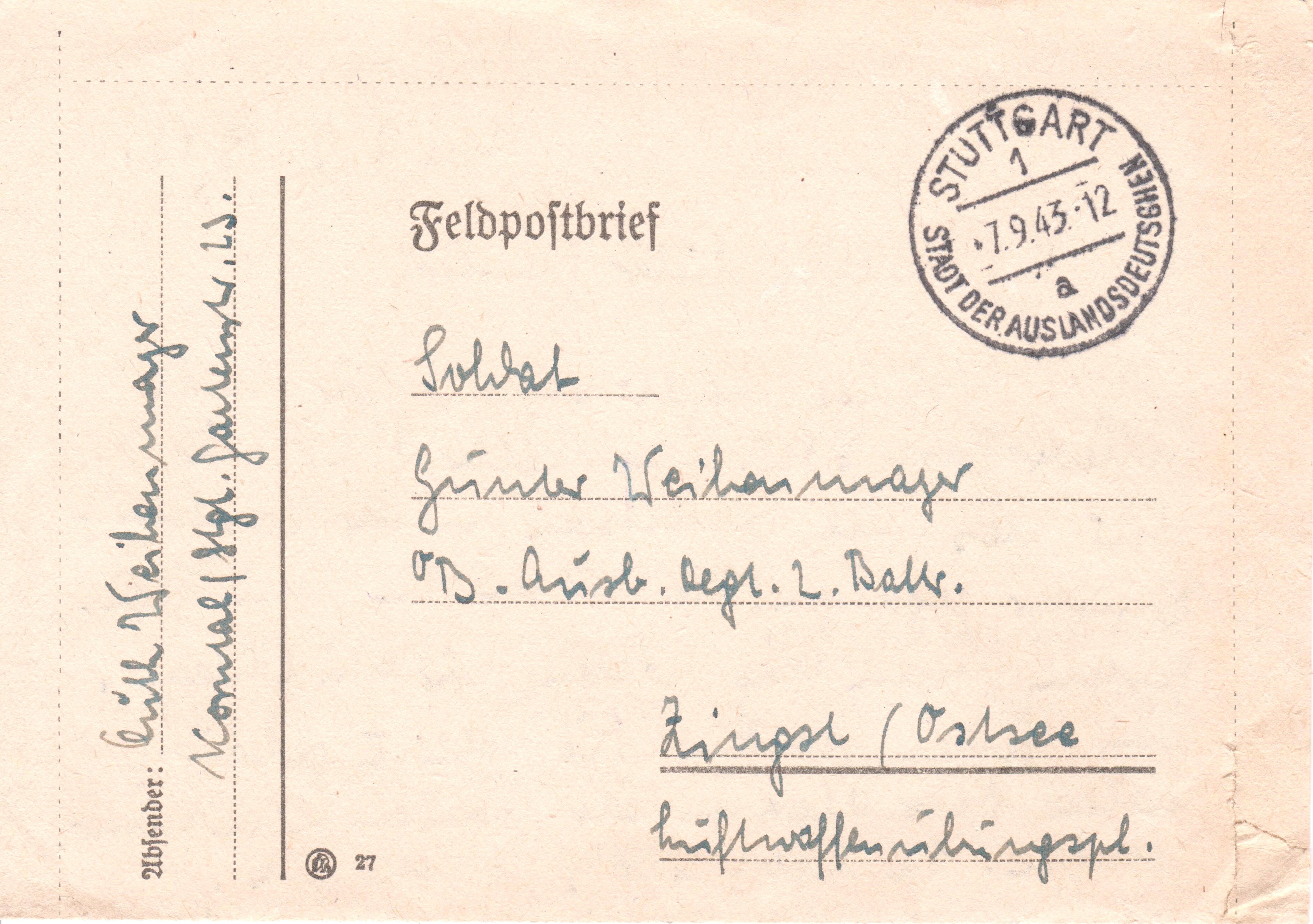 Portofreier Feldpostbrief vom 16.08.1943 mit Tagesstempel "STUTTGART 9 c STADT DER AUSLANDSDEUTSCHEN":