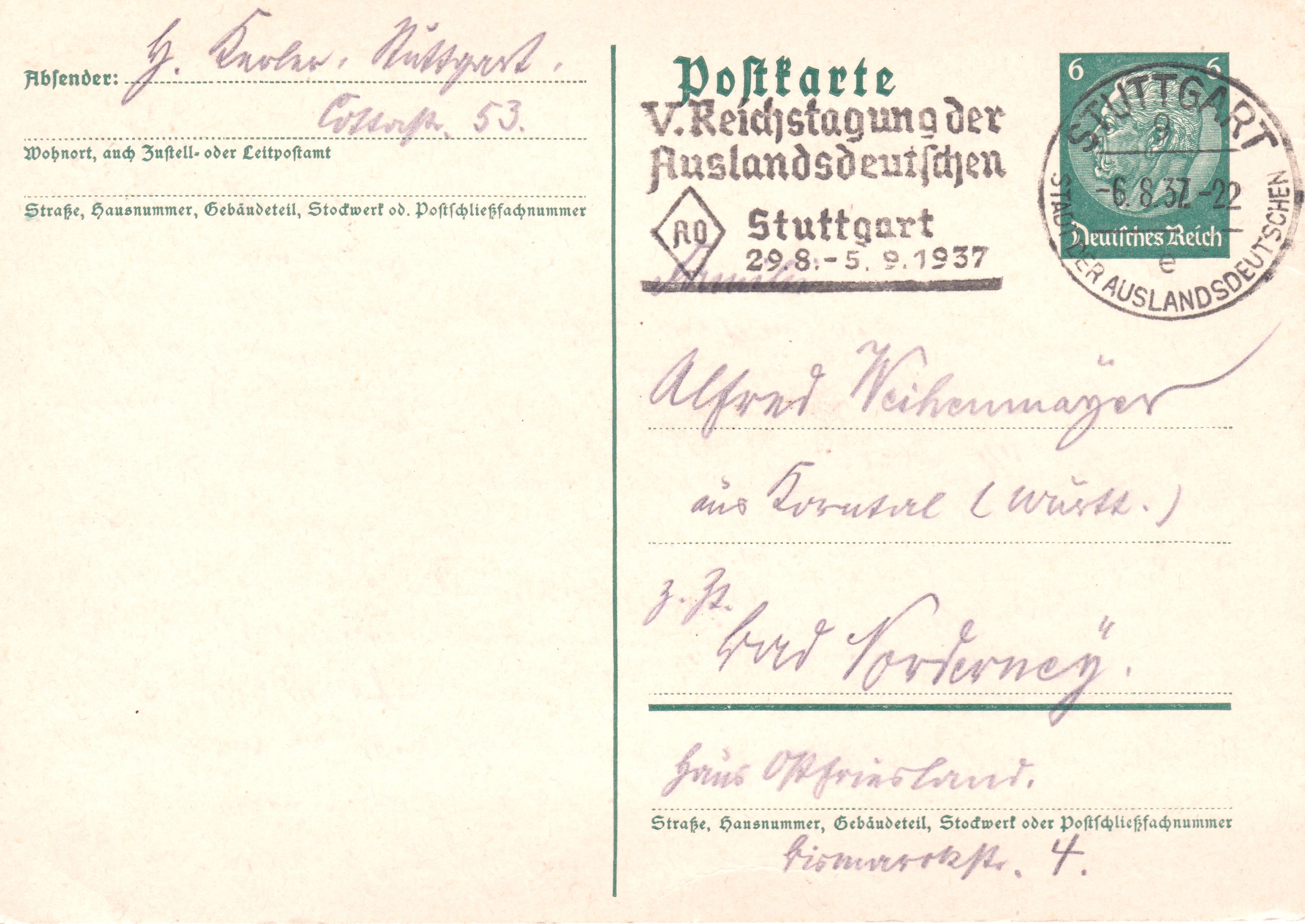 Maschinenstempel "STUTTGART 9 e STADT DER AUSLANDSDEUTSCHEN" mit Werbeeinsatz "V. Reichstagung der Auslandsdeutschen":