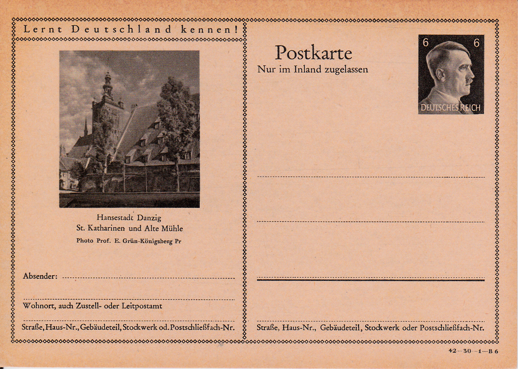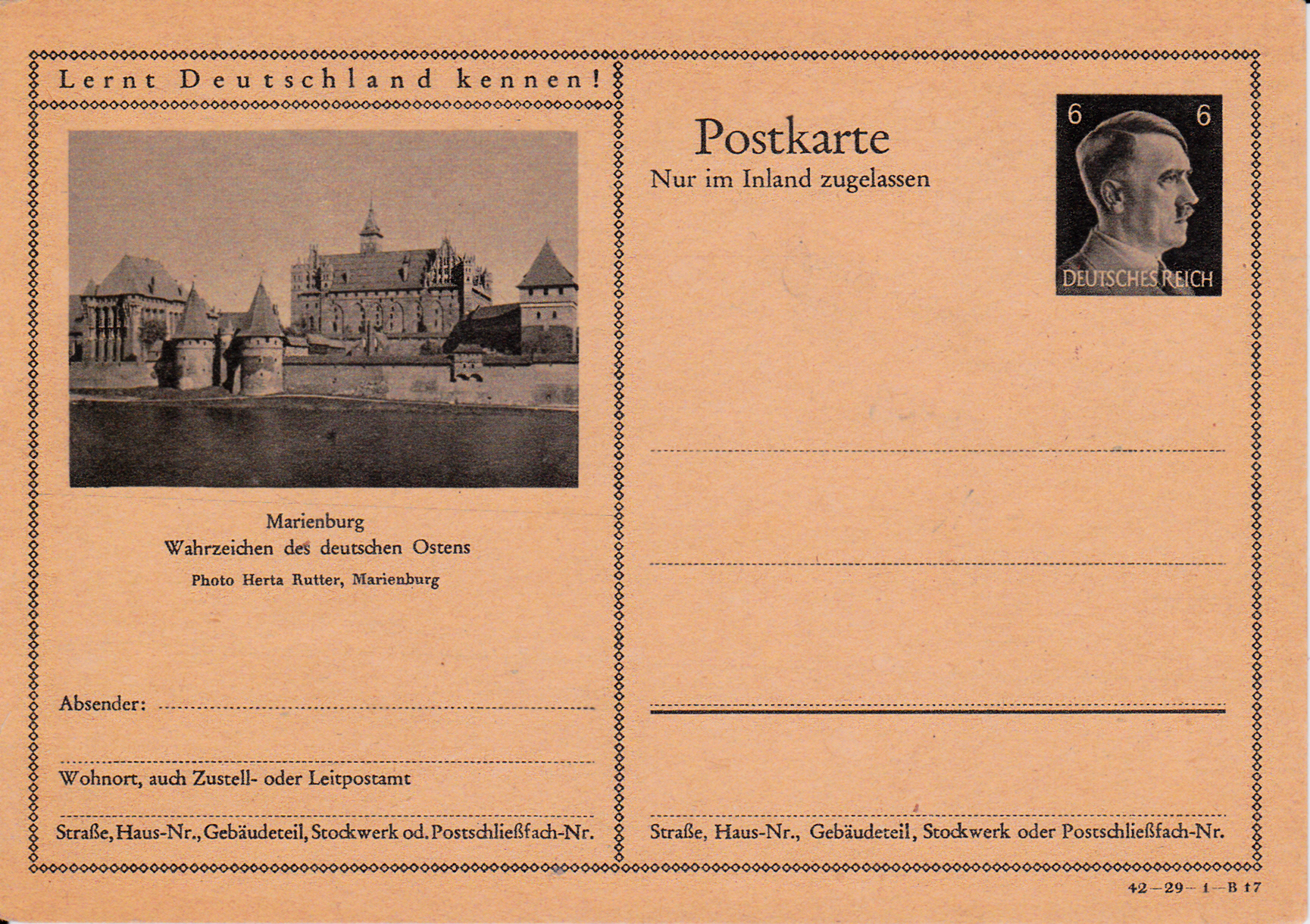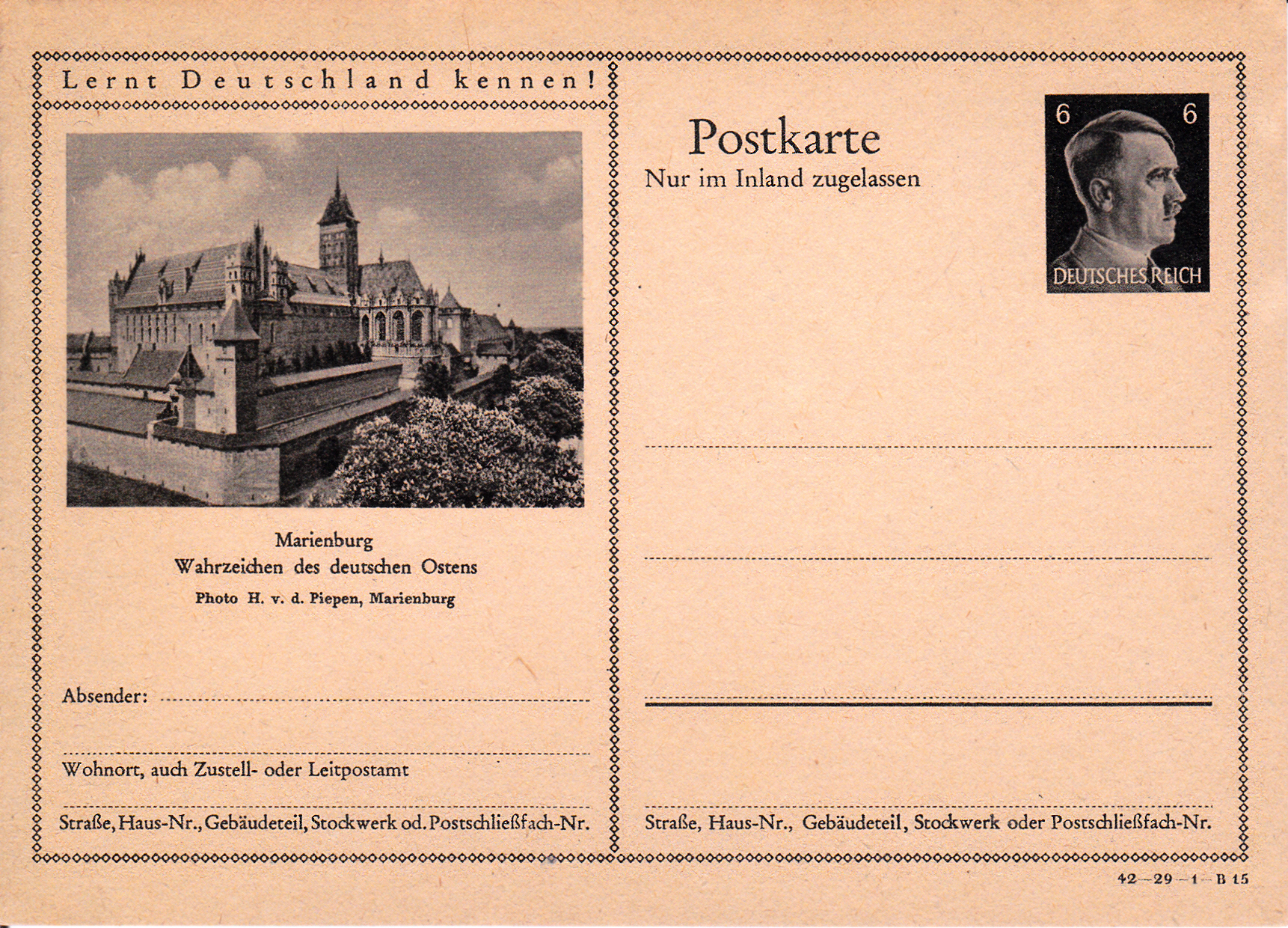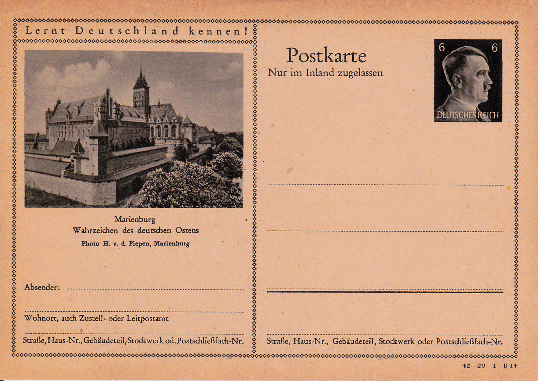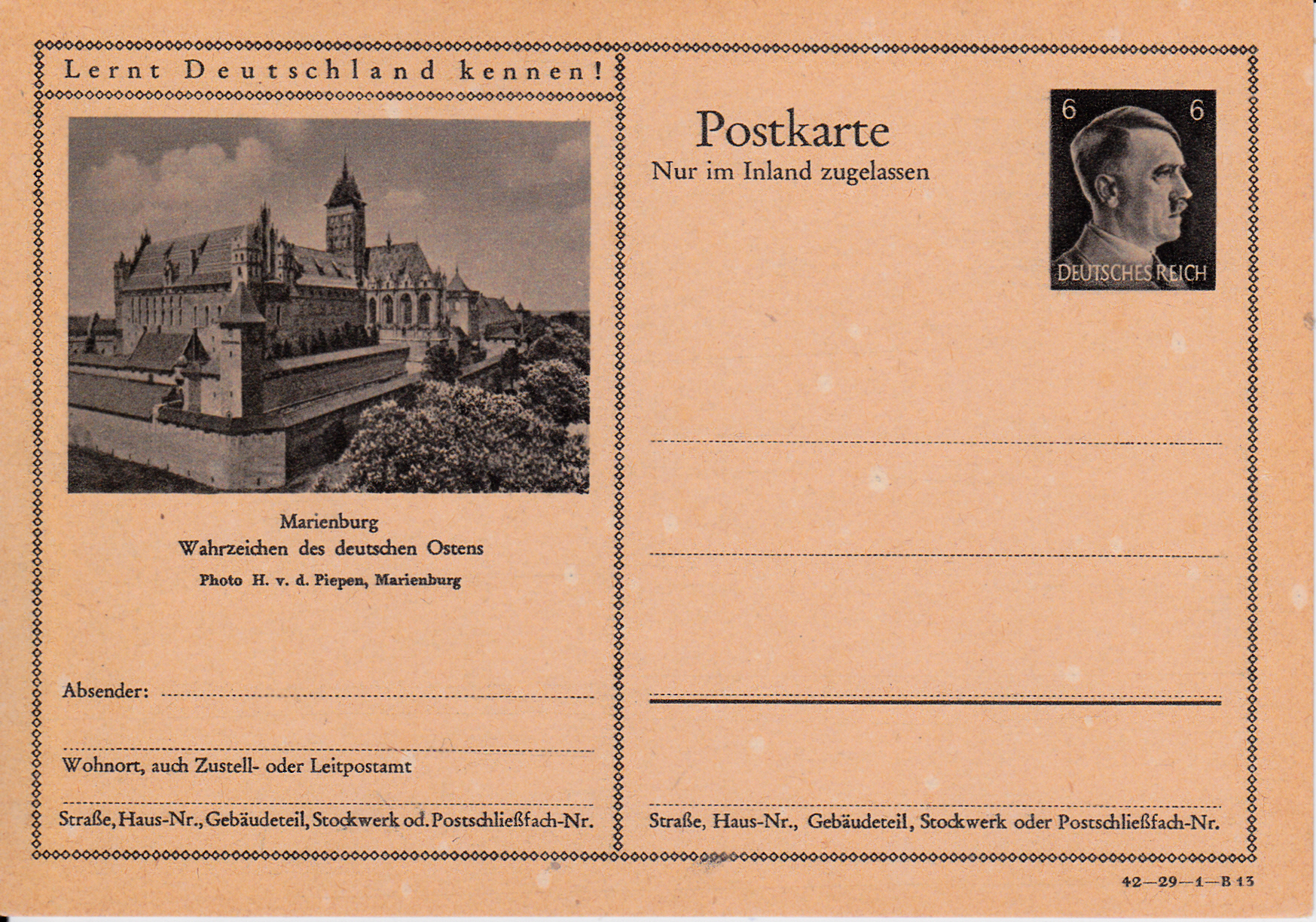 Die Marienburg (polnisch Zamek w Malborku) ist eine im 13. Jahrhundert erbaute mittelalterliche Ordensburg des Deutschen Ordens an der Nogat, einem Mündungsarm der Weichsel. Sie liegt am Rande der Stadt Marienburg (poln. Malbork) im Weichseldelta. Auf dieser Bildpostkarte (Serie 29 Bild 13) wird die Marienburg gezeigt.