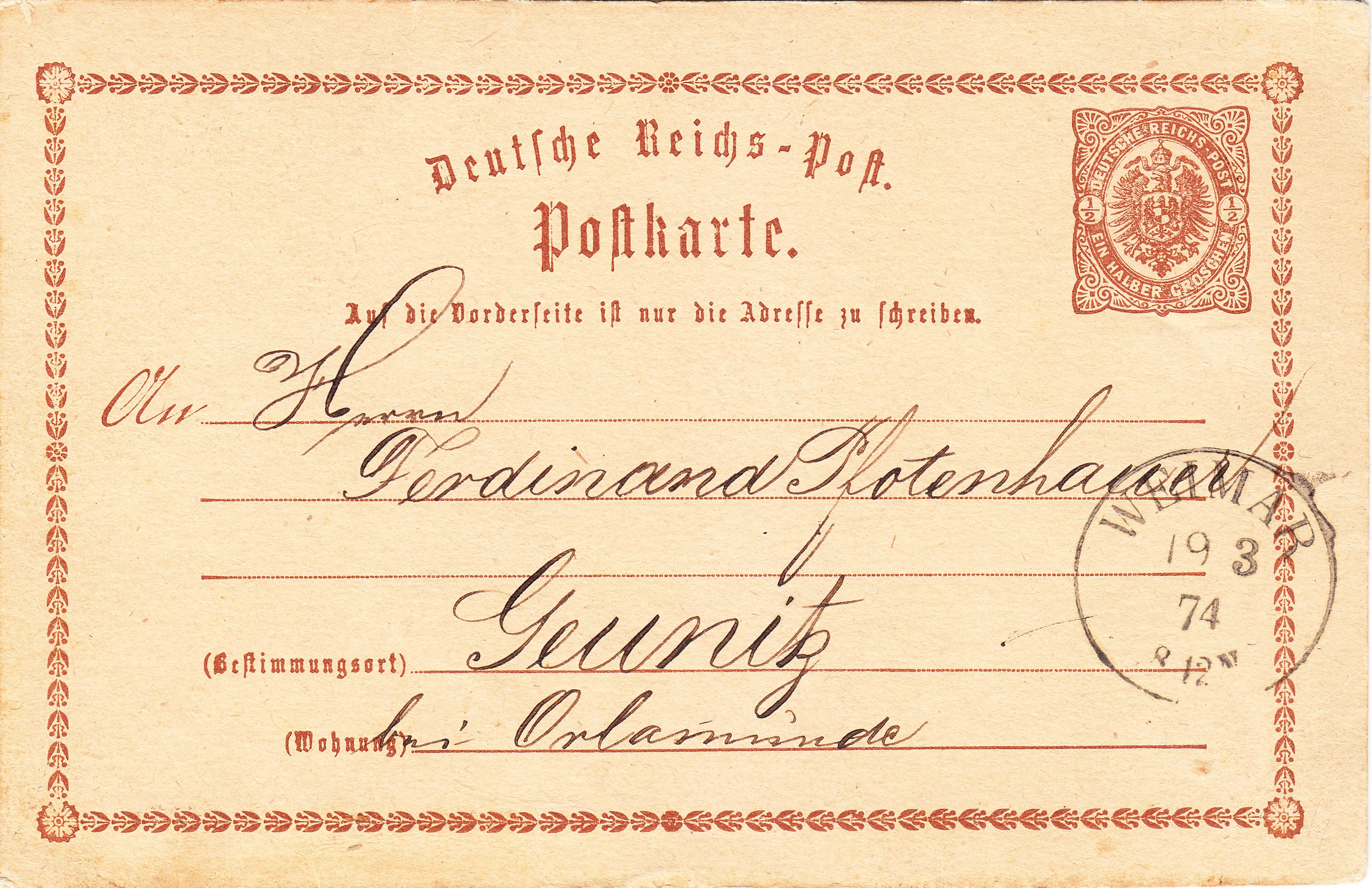 Adressiert wurde diese Ganzsache nach "Geunitz bei Orlamünde". Geunitz gehört heute zur Gemeinde Reinstädt im Süden des thüringischen Saale-Holzland-Kreises.