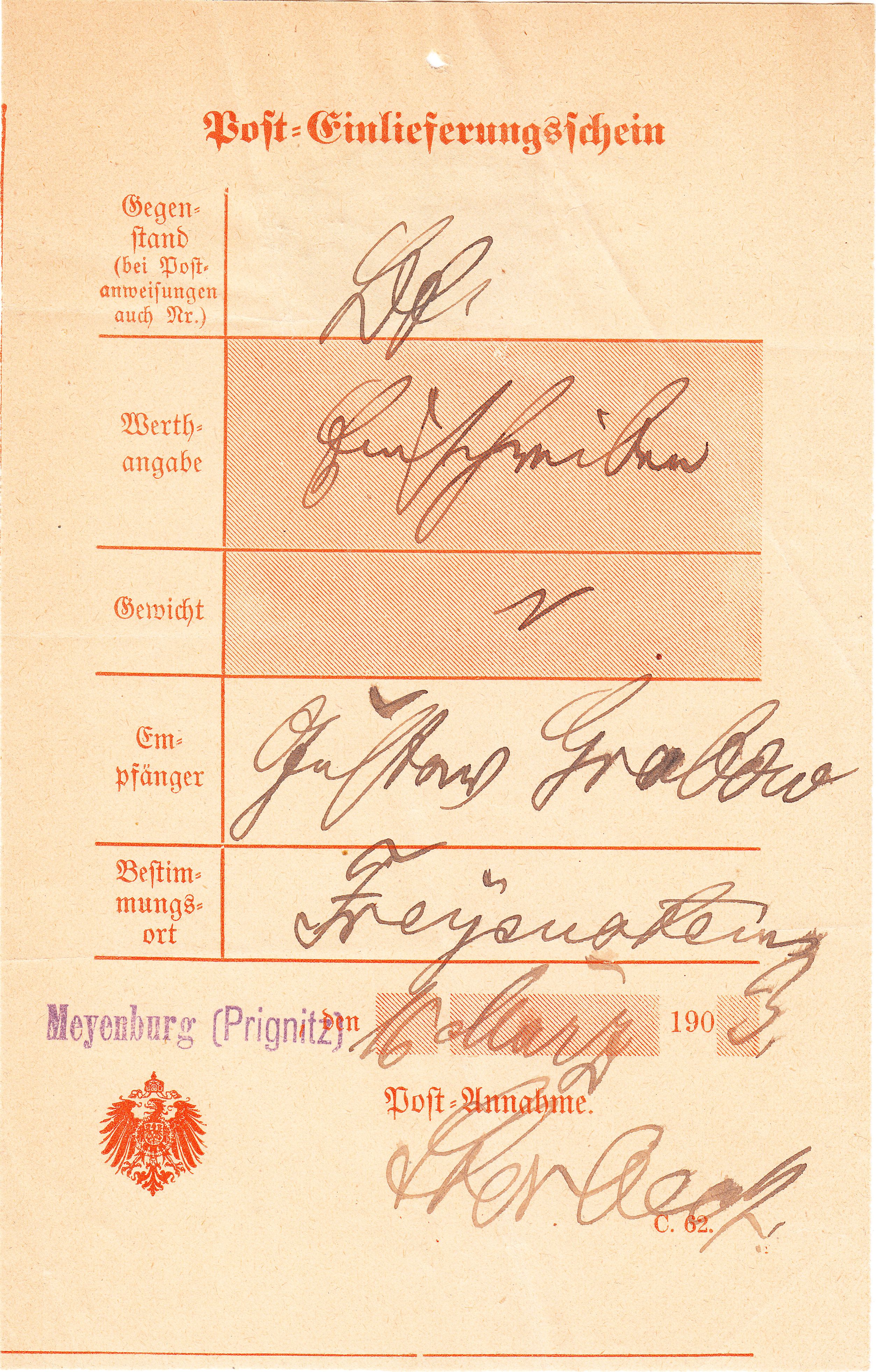 Hier ein Vordruck Post-Einlieferungsschein "190_", am 16.03.1903 verwendet in "Meyenburg (Prignitz)":