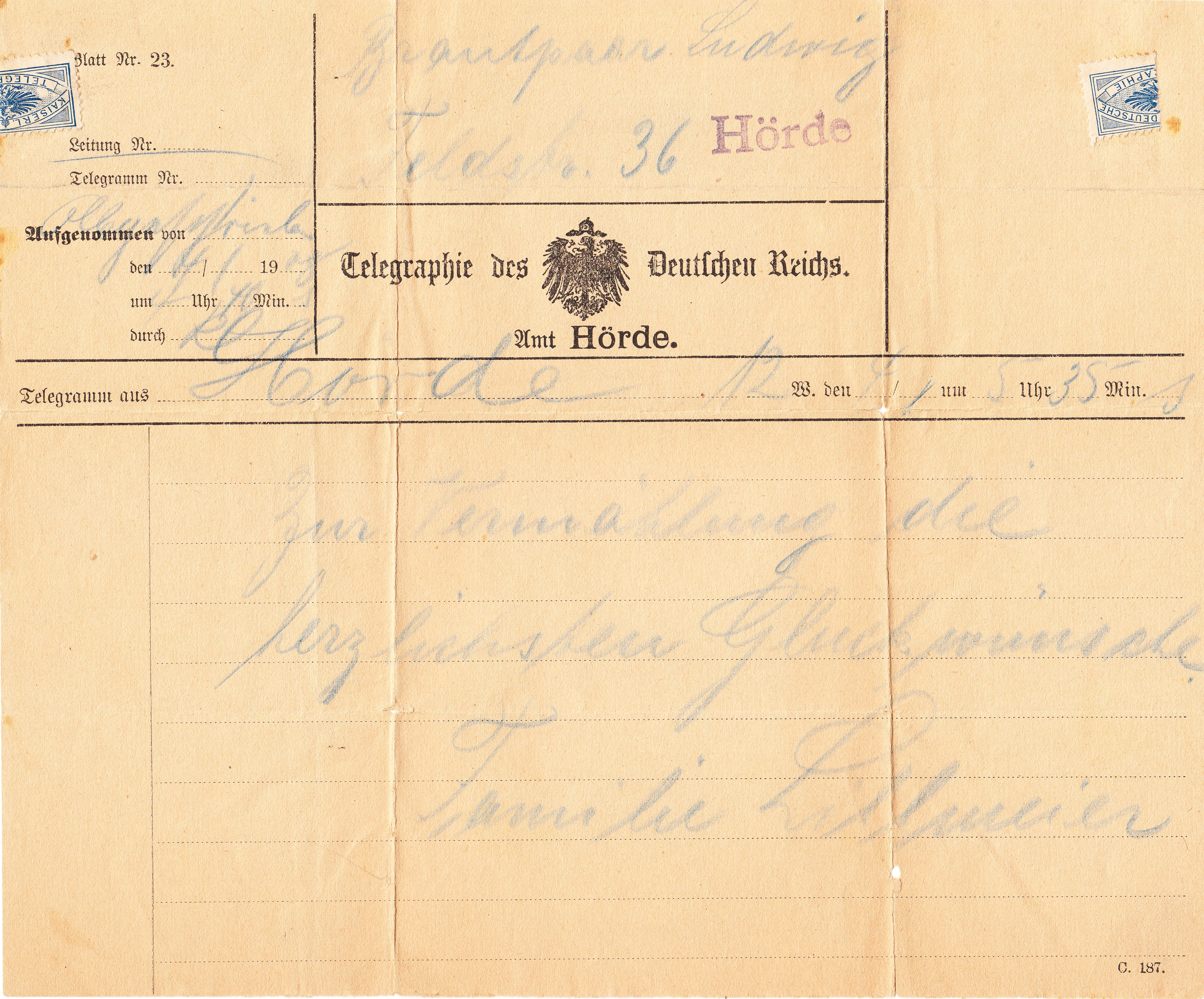 Eingehende Telegramme wurden zu dieser Zeit auf lokalen Vordrucken handschriftlich dokumentiert, hier ein Beispiel "Telegraphie des Deutschen Reiches Amt Hörde" mit Vordruck der "Jahrhundertzahl" = "19":