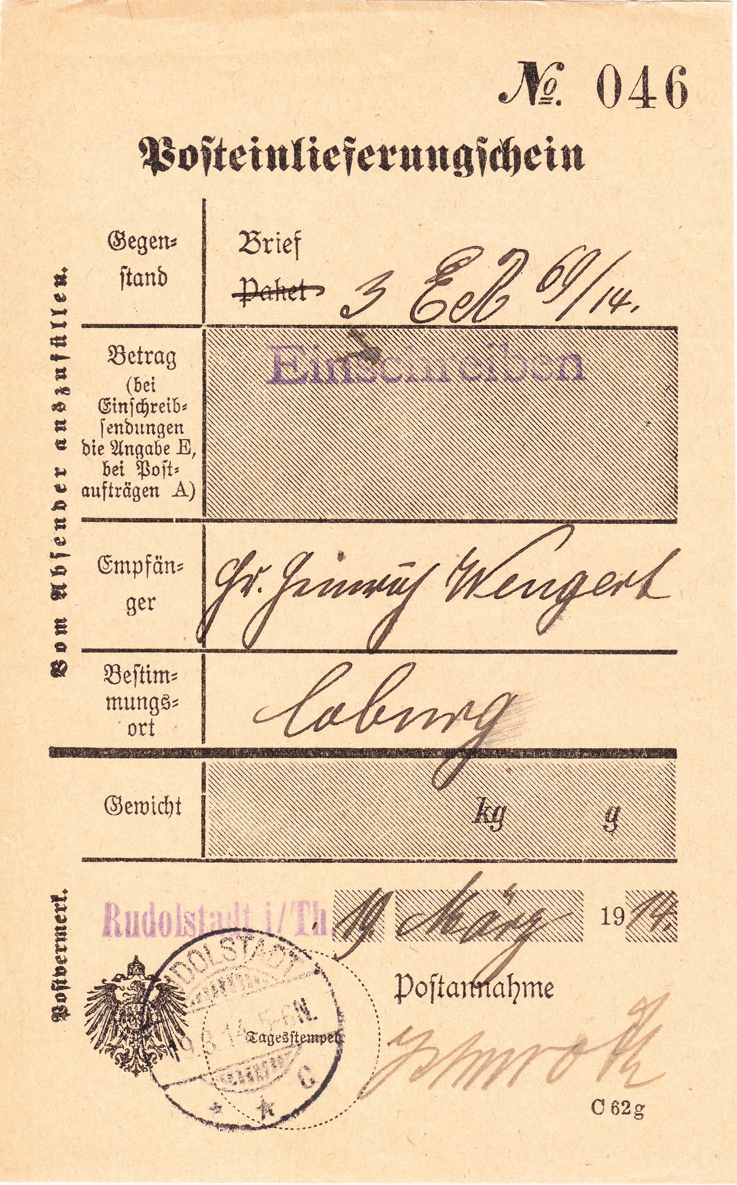 Dieses Exemplar wurde am 19.03.1914 in RUDOLSTADT in Thüringen verwendet, wo ein Kreisbrückenstempel mit Gitterbogen oben und unten RUDOLSTADT * * C abgeschlagen wurde.