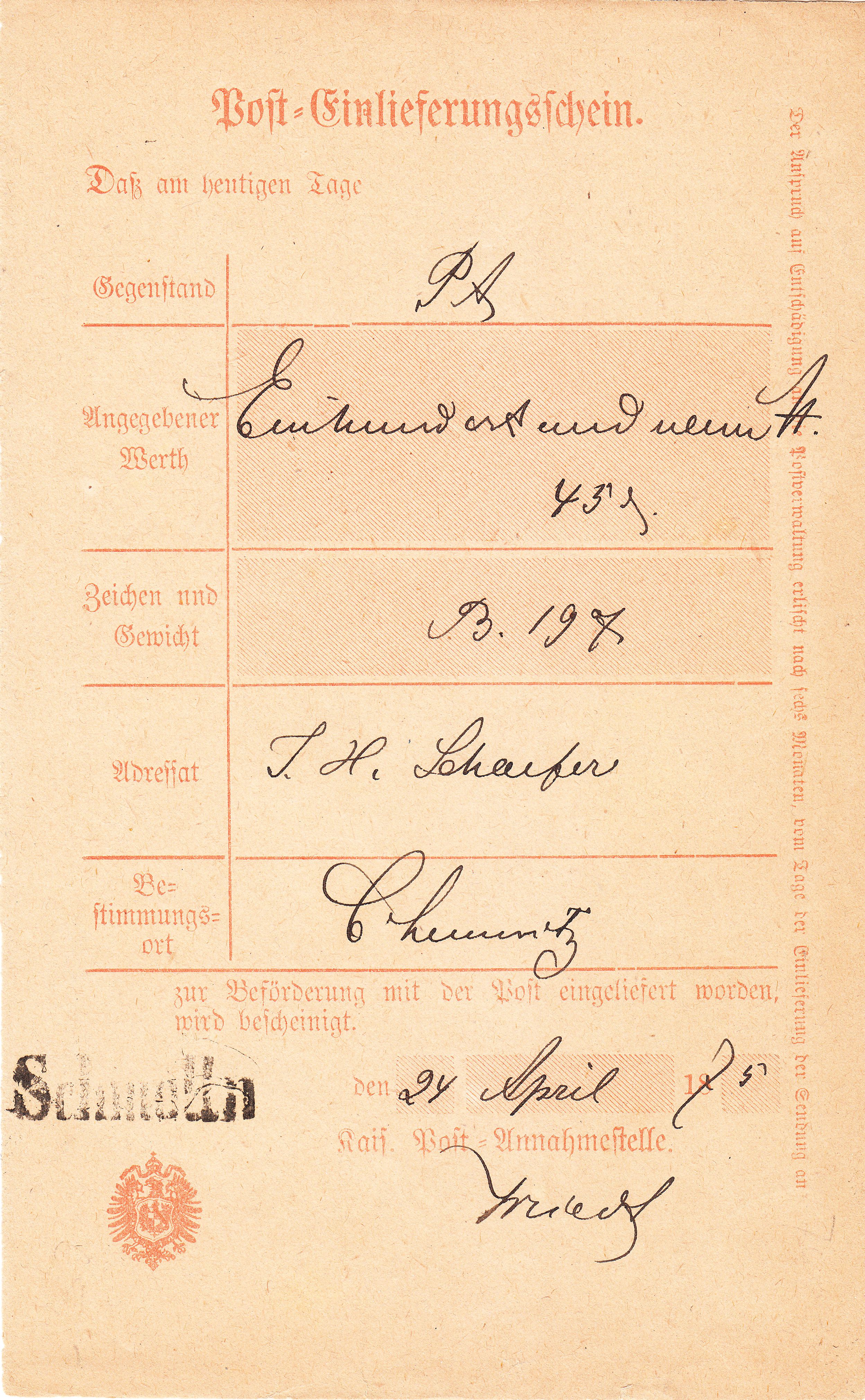 Dieses Formular "Post-Einlieferungsschein" wurde am 24.04.1875, also während der verlängerten Gültigkeitsdauer der Brustschildmarken in Talerwährung nach Einführung der Markwährung, im sächsischen "Schmölln" gebraucht: