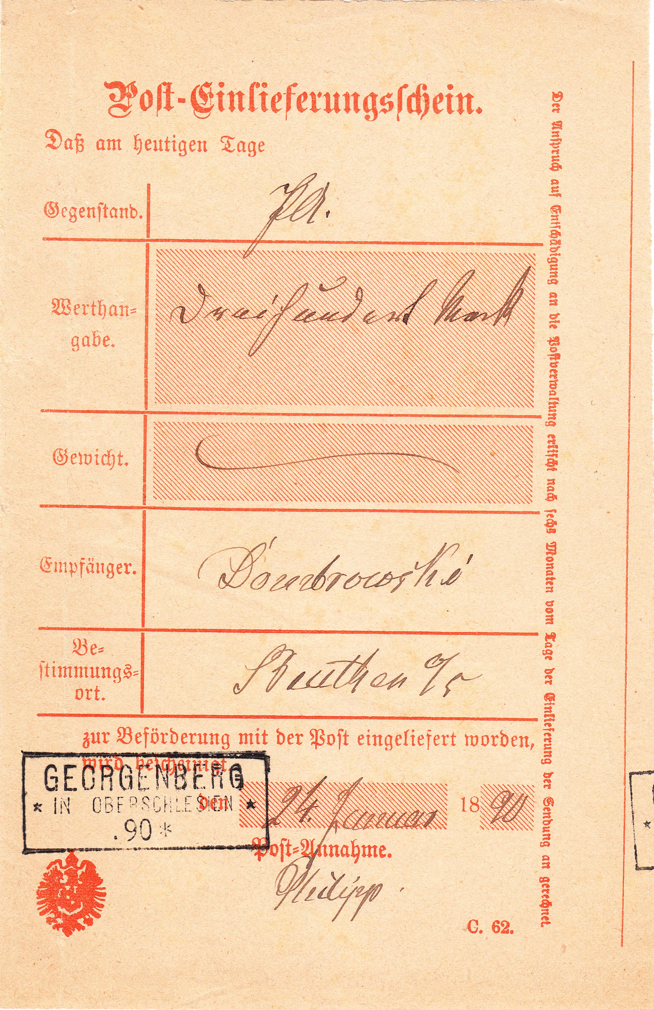 Dieser Vordruck "Post-Einlieferungsschein" wurde am 24.01.1890 in "GEORGENBERG IN OBERSCHLESIEN" gebraucht, wobei ein aptierter dreizeiliger Rechteckstempel zum Einsatz kam: