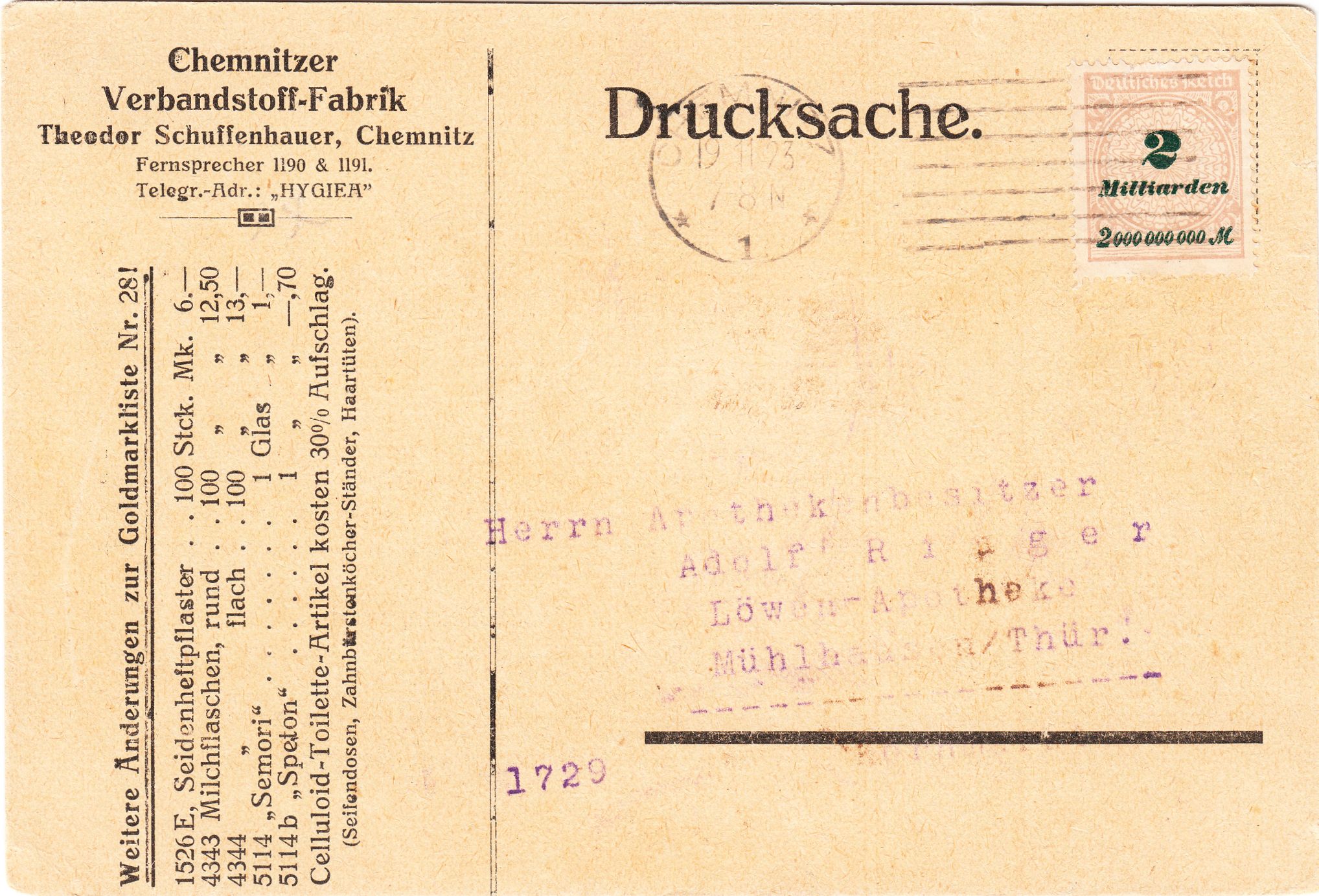 Eine Postkarte im Fernverkehr kostete vom 05.11.1923 bis zum 11.11.1923 ein Porto von 500 Millionen Mark.