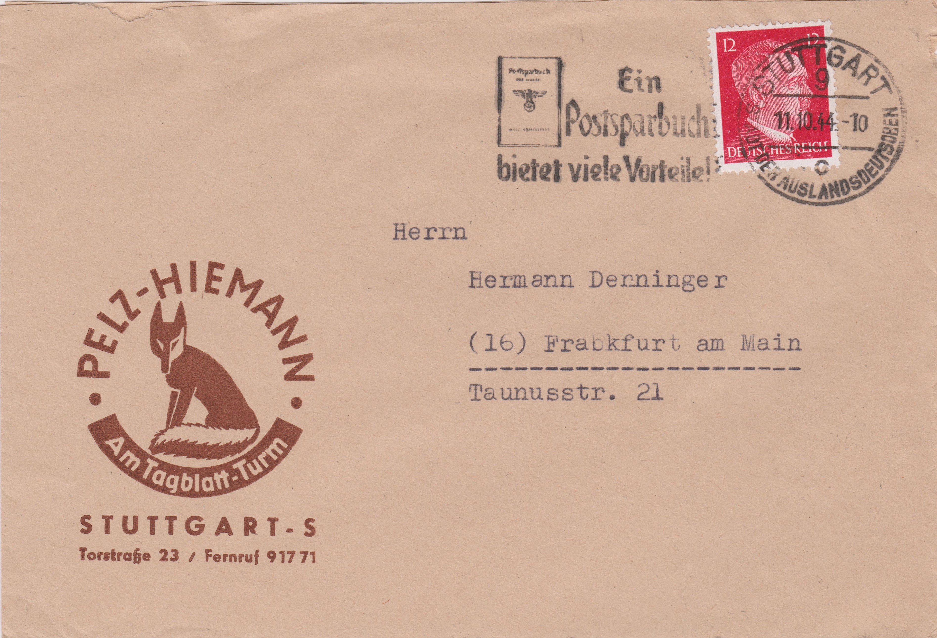 Brief im Fernverkehr nach Frankfurt am Main, Portostufe 12 Pf, dargestellt per Einzelfrankatur der Dauerserie Adolf Hitler, entwertet am 11.10.1944 in "STUTTGART 9 c STADT DER AUSLANDSDEUTSCHEN" mit Posteigenwerbung "Ein Postsparbuch bietet viele Vorteile!":