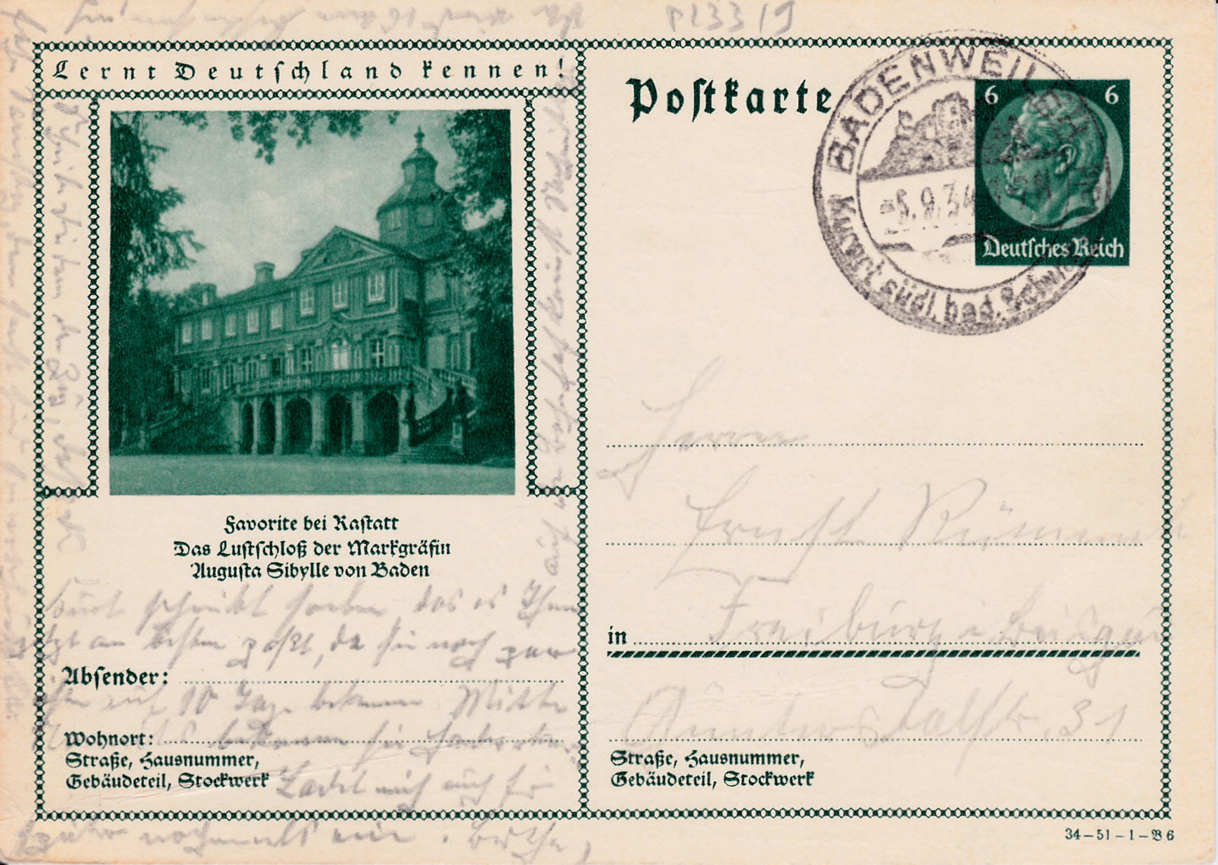Das Schloss Favorite in Rastatt zeigt uns diese Karte (Serie 51 Bild 5). Es wurde von Johann Michael Ludwig Rohrer 1710 bis 1730 in Rastatt-Förch erbaut. Bauherrin war die Markgräfin Sibylla Augusta von Baden-Baden (1675–1733), die Witwe des sogenannten Türkenlouis, Markgraf Ludwig Wilhelm von Baden-Baden (1655–1707).