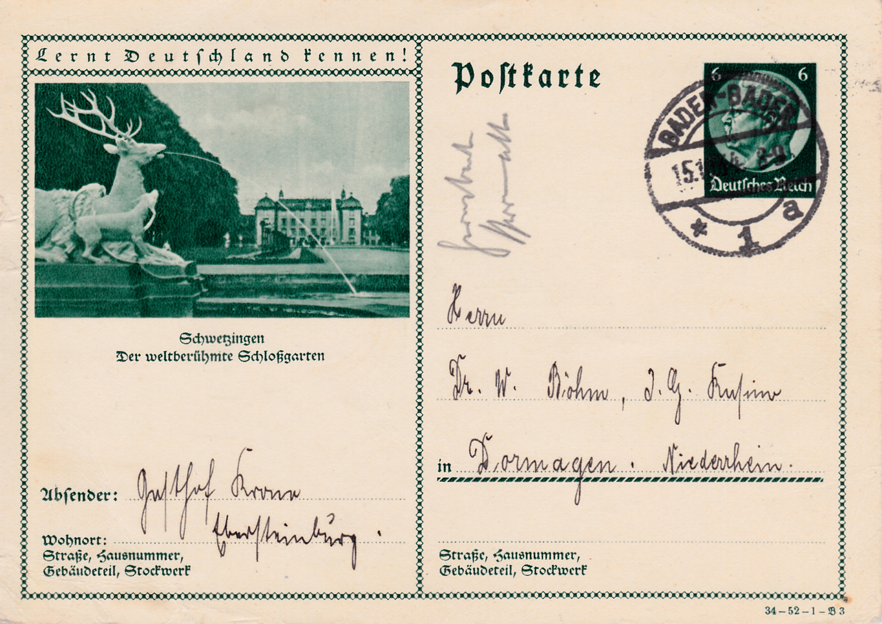 Es folgt nun eine Bildpostkarte (Serie 52 Bild 3) mit einem Foto aus dem Schlossgarten in Schwetzingen.