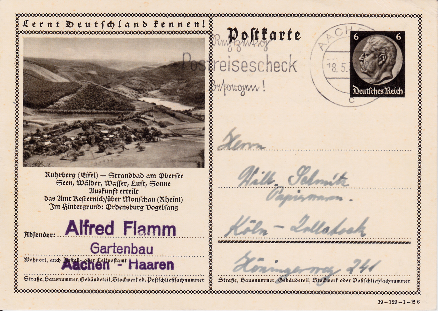 Ruhrberg (ab 1955 Rurberg) ist auch 1939 mit einer Karte (Serie 129 Bild 6) vertreten und zeigt ein Foto dem Strandbad am Obersee und der Landschaft um Ruhrberg.