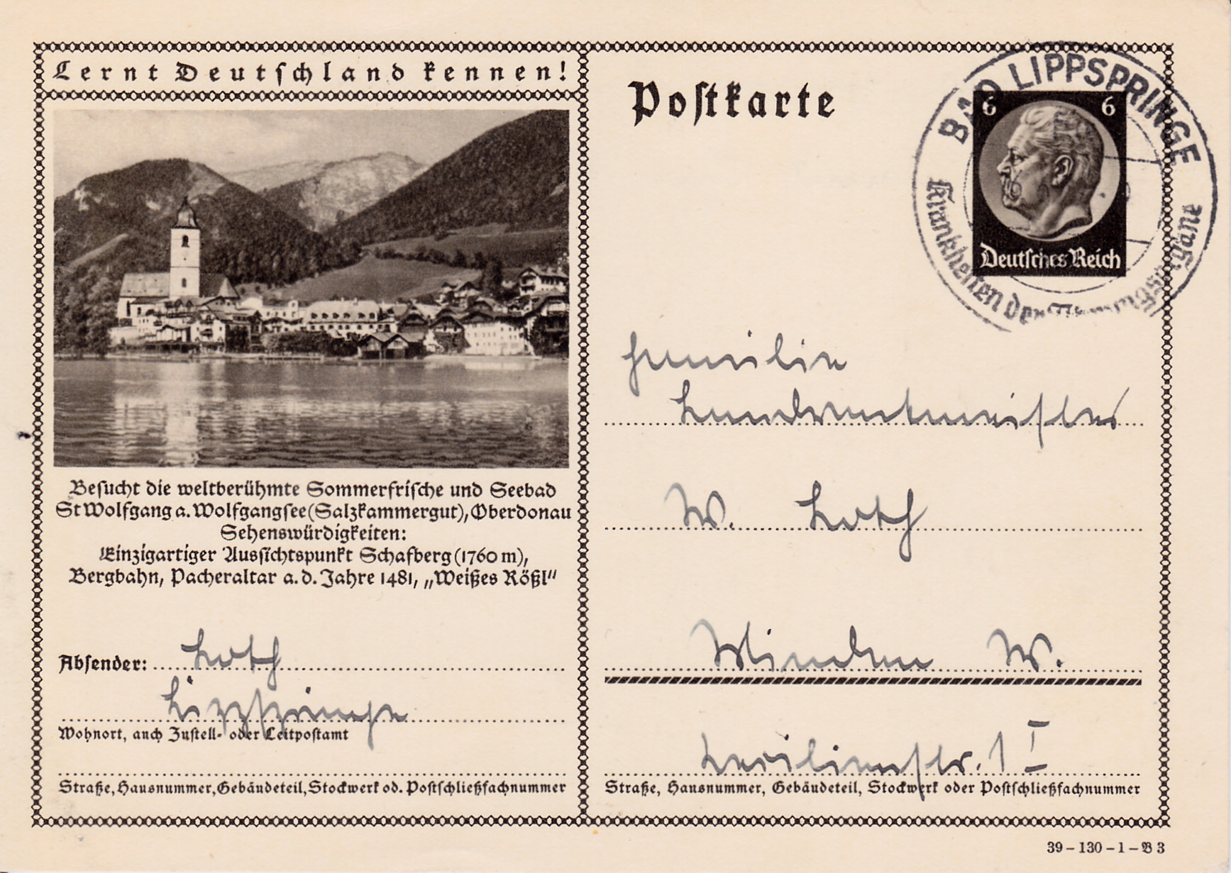 Das Foto dieser Karte (Serie 130 Bild 3) zeigt eine Ansicht von St. Wolfgang am Wolfgangsee mit der Pfarr- und Wallfahrtskirche und dem Hotel Weißes Rössl.