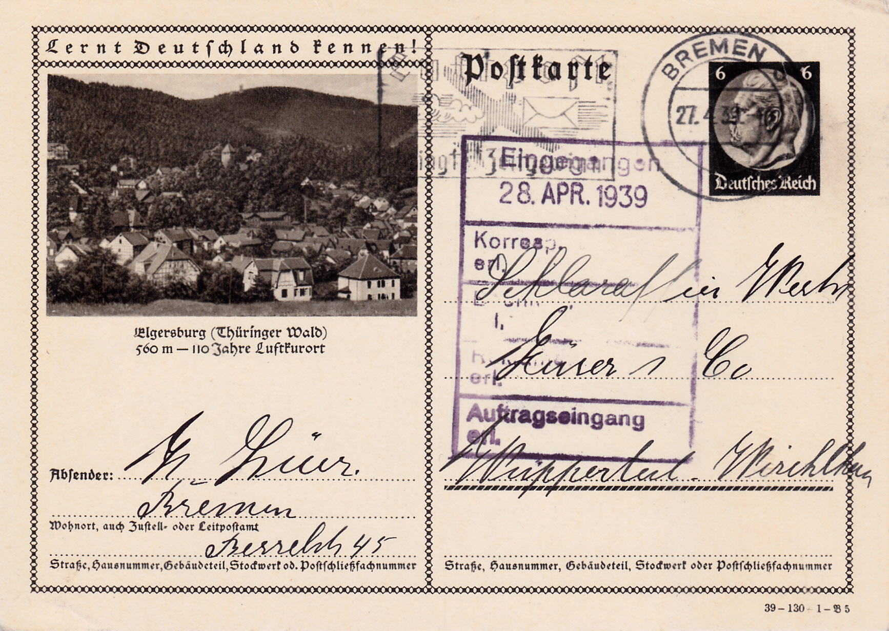 Mit dieser Bildpostkarte (Serie 130 Bild 5) weist Elgersburg (Thüringen) auf sein Jubiläum "110 Jahre Luftkurort" hin.