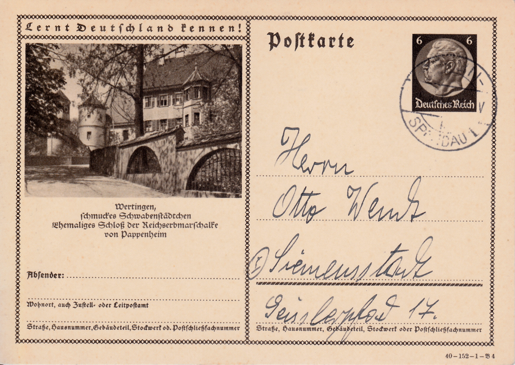 Wertingen zeigt wie 1939 wieder sein Schloss auf dieser Bildpostkarte (Serie 152 Bild 4).