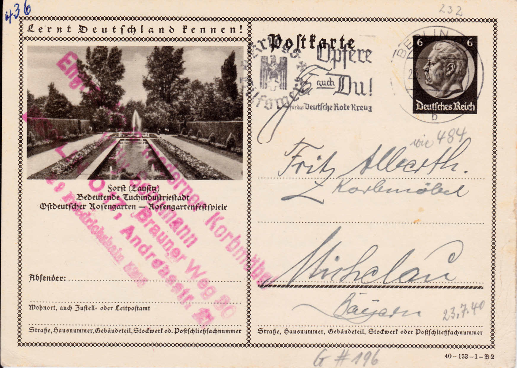 Auf einer zweiten Karte (Serie 153 Bild 2) zeigt Forst ein Foto aus dem Ostdeutschen Rosengarten.