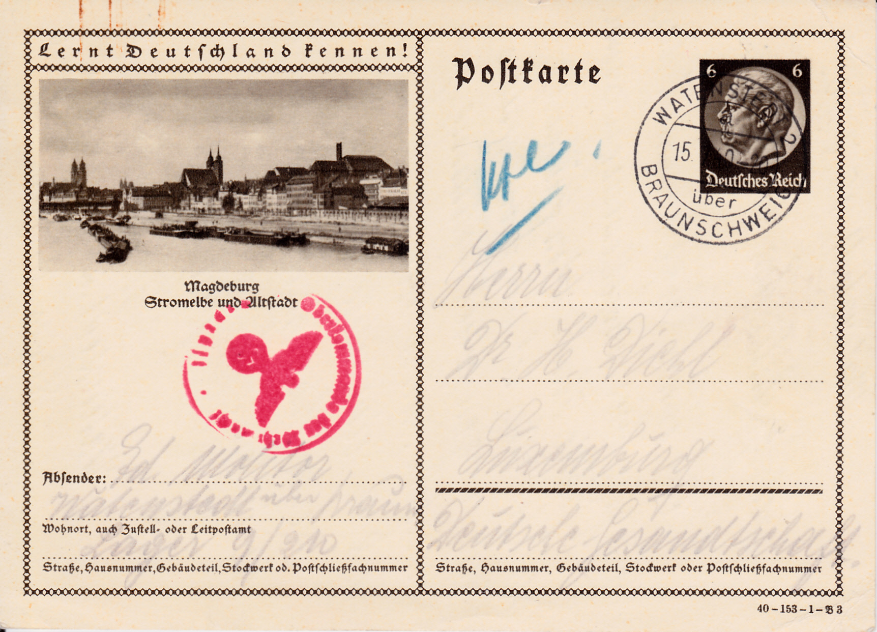 Das Foto aus den Vorjahren 1938 mit der Elbe und der Altstadt Magdeburg ist erneut auf dieser Bildpostkarte (Serie 153 Bild 3) zu sehen.
