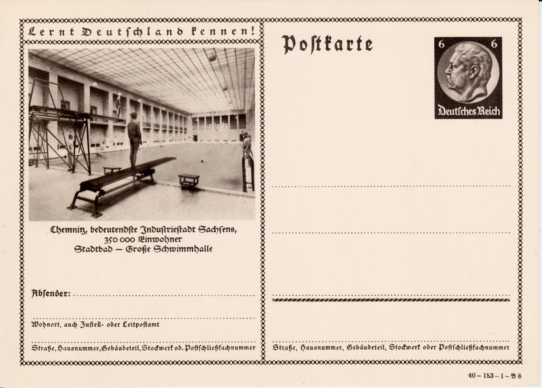 Einen Blick in die Große Schwimmhalle im Stadtbad gewährt uns Chemnitz auf dieser Bildpostkarte (Serie 153 Bild 8).